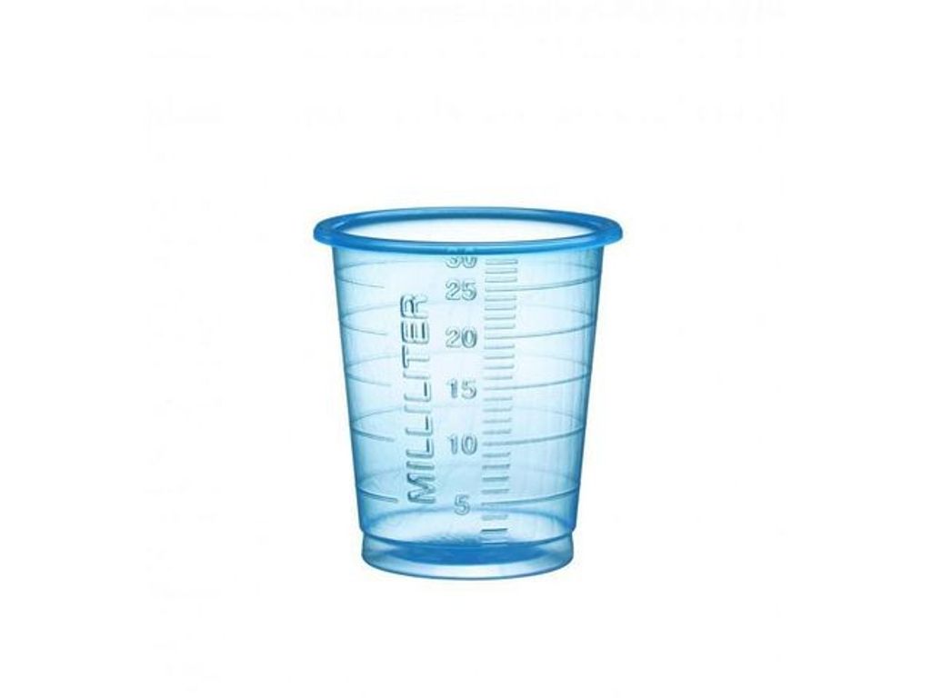 Graderad smal medicinbägare för engångsbruk. Graderad engångsbägare tillverkad i Sverige. - Höjd: 42 mm - Diameter: 35 mm - Färg: Blå/transparent - Volym: 30ml - Antal: 90