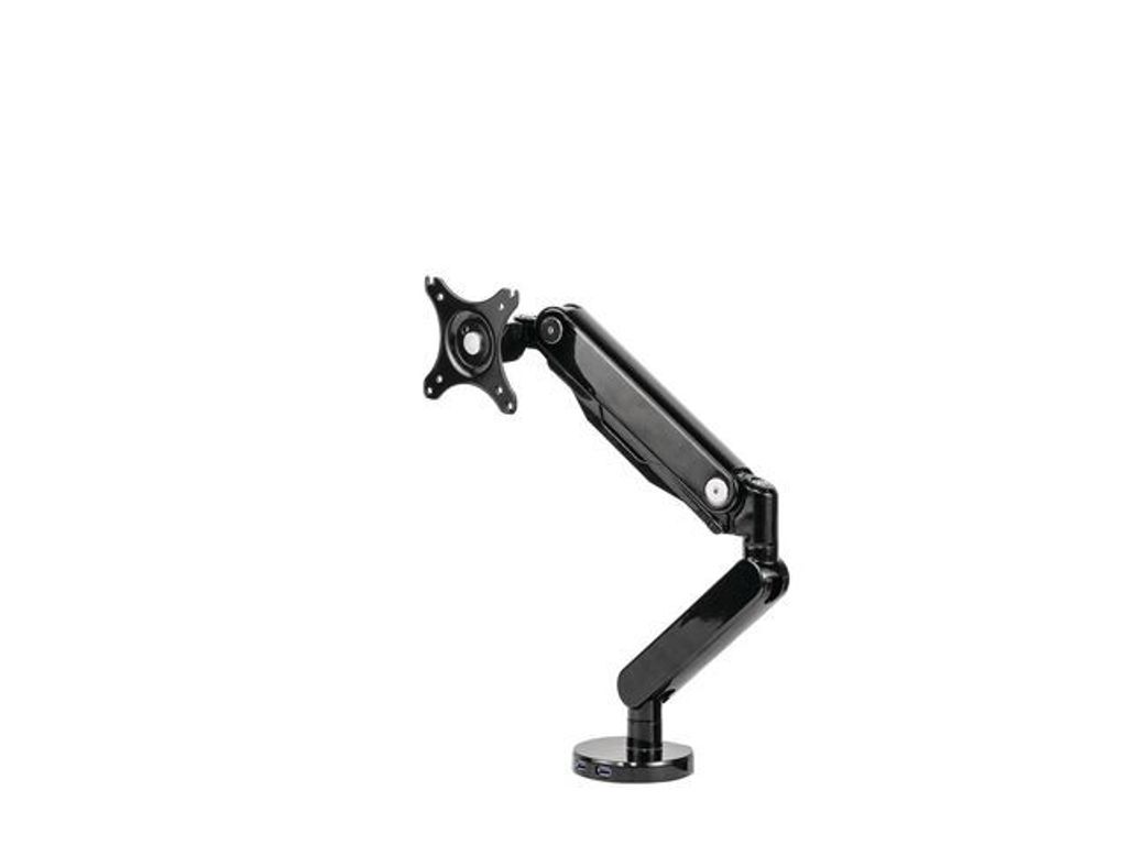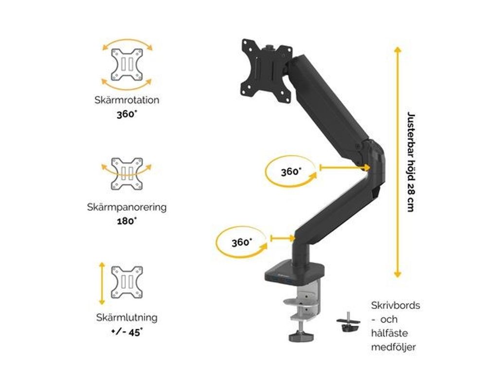 Spara plats på skrivbordet och förbättra din arbetsställningen. Hur förbättrar du din arbetsyta och kroppshållning? En bildskärmsarm med gasfjäder från Fellowes klämmer fast på skrivbordet så att du enkelt kan justera skärmen till den höjd som passar dig bäst, vilket frigör utrymme och gör skrivbordet mindre stökigt. Gasfjäderteknik: Fellowes helt oberoende, justerbara arm för en skärm panorerar 180 °, lutar +85/15 ° och roterar 360 ° tack var den innovativa gasfjädertekniken som gör den enkel att flytta. Inbyggda USB-portar: Inbyggd dubbel USB-anslutning och intuitiv kabelhantering gör att du kan hålla kontakten och göra skrivbordet mindre stökigt. VESA-standard: Monteras enkelt med klämma eller hål, varje arm håller en VESA-standardbildskärm som väger upp till 9 kg (och mäter upp till 30 tum). Maxräckvidd: Maxräckvidden mellan det justerbara bildskärmsstativets bas och användaren är 670 mm. Maxhöjd: Maxhöjden mellan skrivbordet och bildskärmsstativets mitt är 390 mm när skärmarmen befinner sig vid mittstångens bas. - Ergonomisk: Justera skärmens höjd, vinkel och djup för en bekväm position och reducera problem med nacke, axlar och ögon. Mer utrymme på skrivbordet: Maximera skrivbordsutrymmet med ett bordsmonterat fäste med gasfjäder som är lätt att flytta. - Inbyggda USB-portar: Två USB-portar så att du enkelt kan ladda dina enheter.