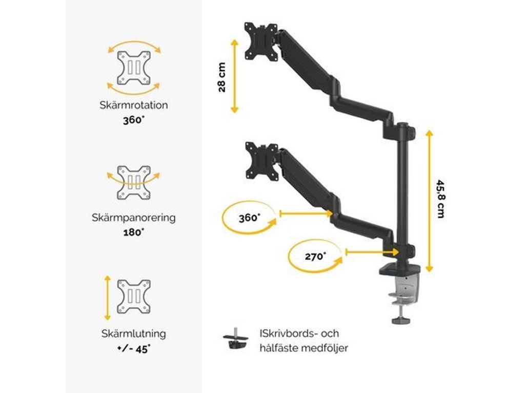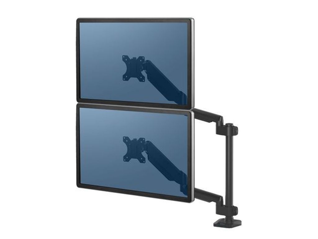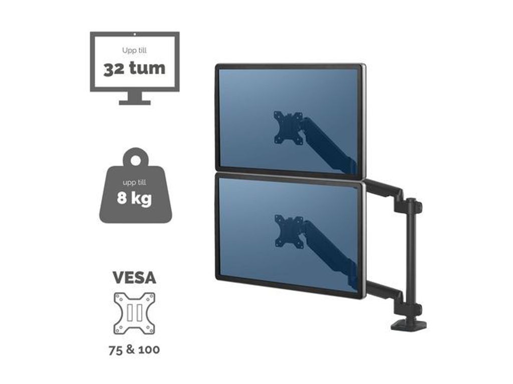 Spara plats på skrivbordet och förbättra din arbetsställningen. Med Fellowes vertikala dubbla skärmarm får du en perfekt skärmposition, bättre kroppshållning vid arbete eller spel och undviker problem med axlar, nacke eller ögon. En arm med dubbla skärmar leder också till bättre produktivitet utan behov av att växla mellan flikar eller program på samma skärm. En skärmarm med gasfjäder är en optimal ergonomisk lösning tack vare den stora flexibiliteten och en mängd olika vinklar, rotera skärmen för att visa kollegor. Gasfjärderfäste: Fellowes Platinum Dual Monitor Arm passar skärmar upp till 40 tum, med en fri höjdjustering på 282 mm och en maxräckvidd på 537 mm. Maxvikt per bildskärm är 8 kg. Göm kablarna med integrerad kabelhantering. Maximera utrymmet på skrivbordet: Förvandla din arbetsmiljö, maximera skrivbordsutrymmet och produktiviteten. Med en lutningsjustering på +85 °/-30 ° kan du luta skärmen framåt eller bakåt, perfekt för att läsa text eller stå en stund. Enkel installation Två installationsmetoder för att fästa armen enkelt och säkert på skrivbordet. Testad: av FIRA International Ltd för att uppfylla de ergonomiska kraven i den europeiska hälso- och säkerhetslagstiftningen: EN ISO 9241-5.¿ - Vertikal: Den perfekta lösningen för att arbeta med två skärmar på små arbetsytor. - Innovativ: Fellowes dubbla vertikala bildskärmsfäste har två integrerade USB-portar för enkel laddning av enheter - Gasfjäder: Flytta skärmarna upp, ner och i sidled med flexibel gasfjäderteknik.