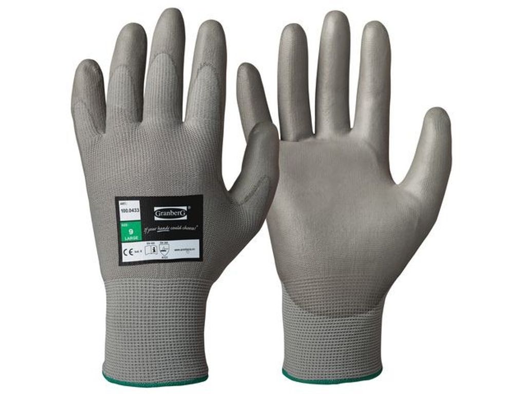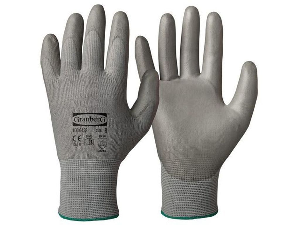 Montagehandskar som är lämpliga för lättare arbete inom montering, transport, underhåll, industri, anläggning, lager och butik. Sömlösa handskar i polyester med beläggning av polyuretan i innerhanden. Idealiska för precisionsarbete då de har mycket god fingerkänsla och en bra slitstyrka, trots den lätta känslan på handen. - Godkända enligt: EN 420:2003, EN 388:2003, EN 388:2016, CE - Skyddsklass: II - Material: polyester - Doppningsmaterial: PU - Passform: tight - Färg: grå - Storlek: S11