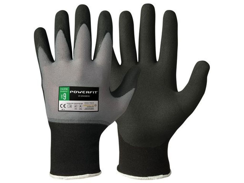 Montagehandskar med mikrokapillär nitrilskumbeläggning. Lämpliga för arbete inom t.ex. montering, transport, lager och underhåll. Montagehandskar Powerfit by Granberg med extra tunn nylonväv (18 gauge) och sandig nitrilskumsbeläggning. Med ett enastående torr-, våt- och oljegrepp och en utmärkt slitstyrka, samtidigt som du får den optimala fingerkänslan. Sanitized-behandlade för att förhindra bakterietillväxt och ge en fräsch känsla. Lämpliga för lätt till medeltungt arbete inom montering, transport, underhåll, industri, anläggning och lager. - CE-certifierade - Godkända enligt: EN 420:2003 + A1:2009, OEKO-TEX® Standard 100, EN 388:2016, EN 407:2004, EN 388:2003 - Skyddsklass: II - Foder: nylon/spandex - Doppningsmaterial: nitril - Grepp: torrgrepp, våtgrepp, oljegrepp - Längd: 21-28 cm - Färg: svart, grå - Storlek: 8