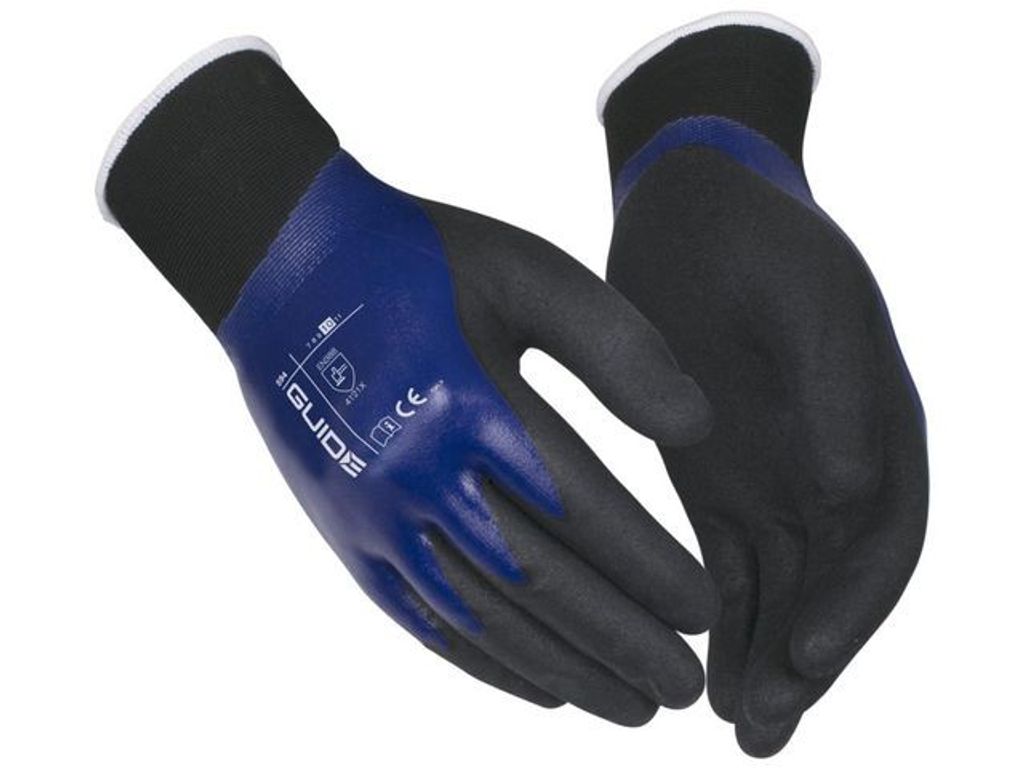 GUIDE 594 är en vattenavvisande, smidig handske i nitril. Passar för användning inom exempelvis bygg, vägarbeten, metallarbeten och avfallshantering. Arbetshandsken GUIDE 594 är tunn handske med heldoppad och dubbeldoppad handflata. Godkänd för kontaktvärme nivå 1. Bra oljegrepp. - CE-certifierad - Godkänd enligt: EN 420:2003, EN 388:2016 4121X, EN 407:2004 X1XXXX, ÖKO-TEX - Material utsidan av handske: Nitril, doppad handflata, heldoppad, foamed - Material insidan av handske: Enkelstickad, elastan, nylon - Gauge: 18 - Slitstyrka: 7 - Färg: Blå, svart - Storlek: 8