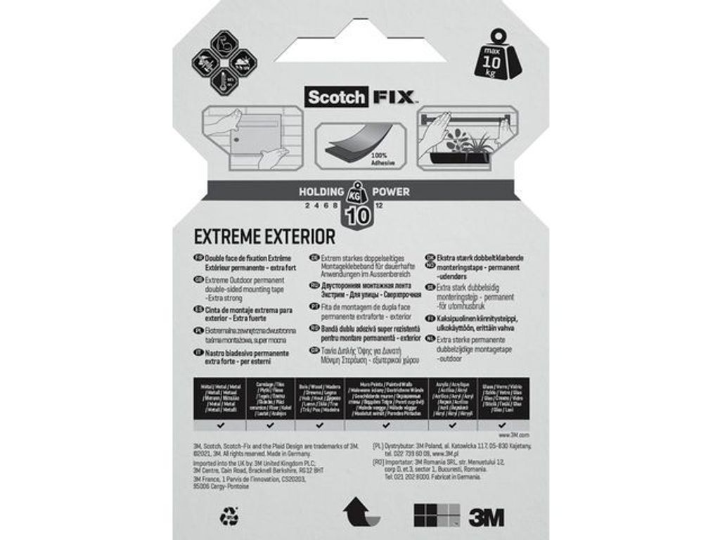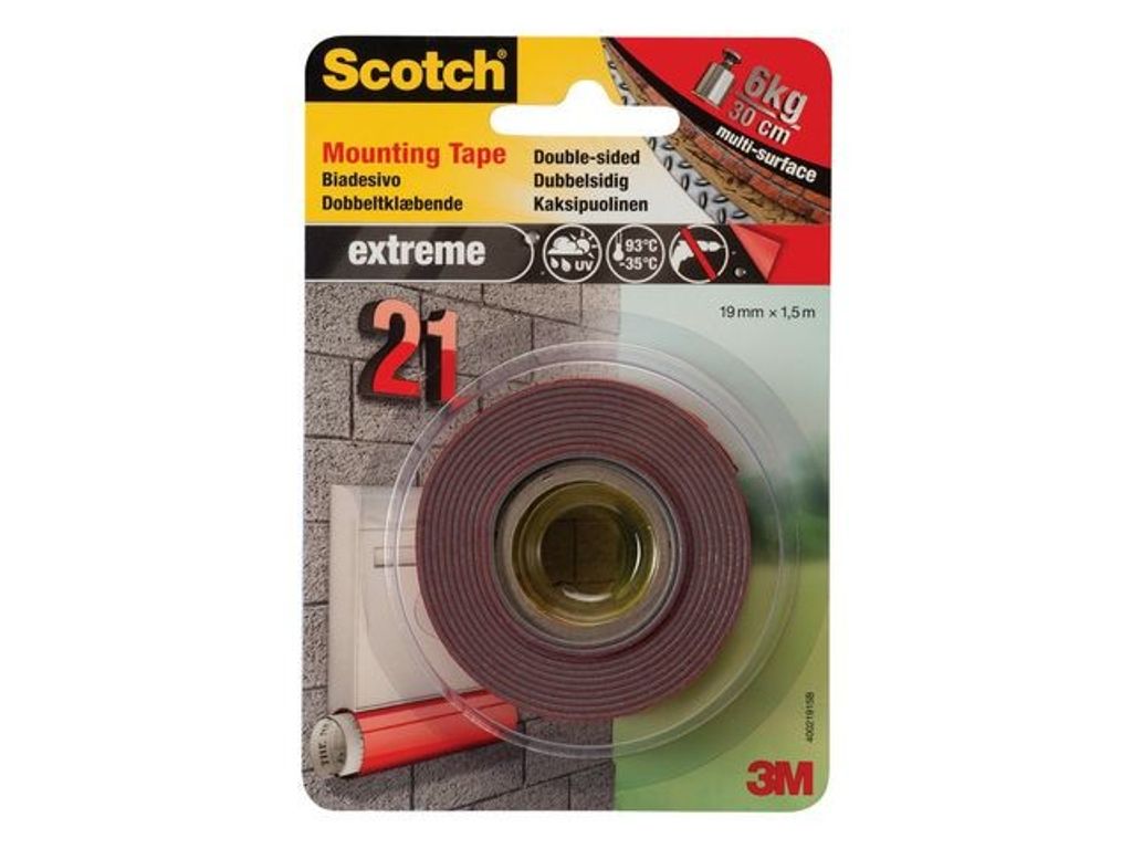 Den här extra starka och dubbelsidiga monteringstejpen fäster på de flesta ytor, inklusive ojämna ytor. Den dubbelsidiga monteringstejpen Scotch® Extreme kan användas på flera ytor för permanent fästning av objekt både inom- eller utomhus. En remsa på 30 cm kan bära objekt på upp till 6 kg, och den kan användas på en mängd icke-känsliga ytor såsom metaller, plast, tegel, glasfiber och skum. Den här tåliga och dubbelhäftande tejpen från Scotch® är också lämplig för utomhusbruk i miljöer med extremt låga eller höga temperaturer och luftfuktighet. Den är dessutom UV-beständig. Varje tejprulle mäter 19 mm x 1,5 m. - Extra kraftfull tejp - Dubbelsidig så att kan användas för montering av objekt - Kan användas på flera ytor, inklusive släta eller ojämna - Lämplig att användas inom- och utomhus - UV-resistent - Remsa på 30 cm kan hålla ett objekt på upp till 6 kg - Mått: 19 mm x 1,5 m