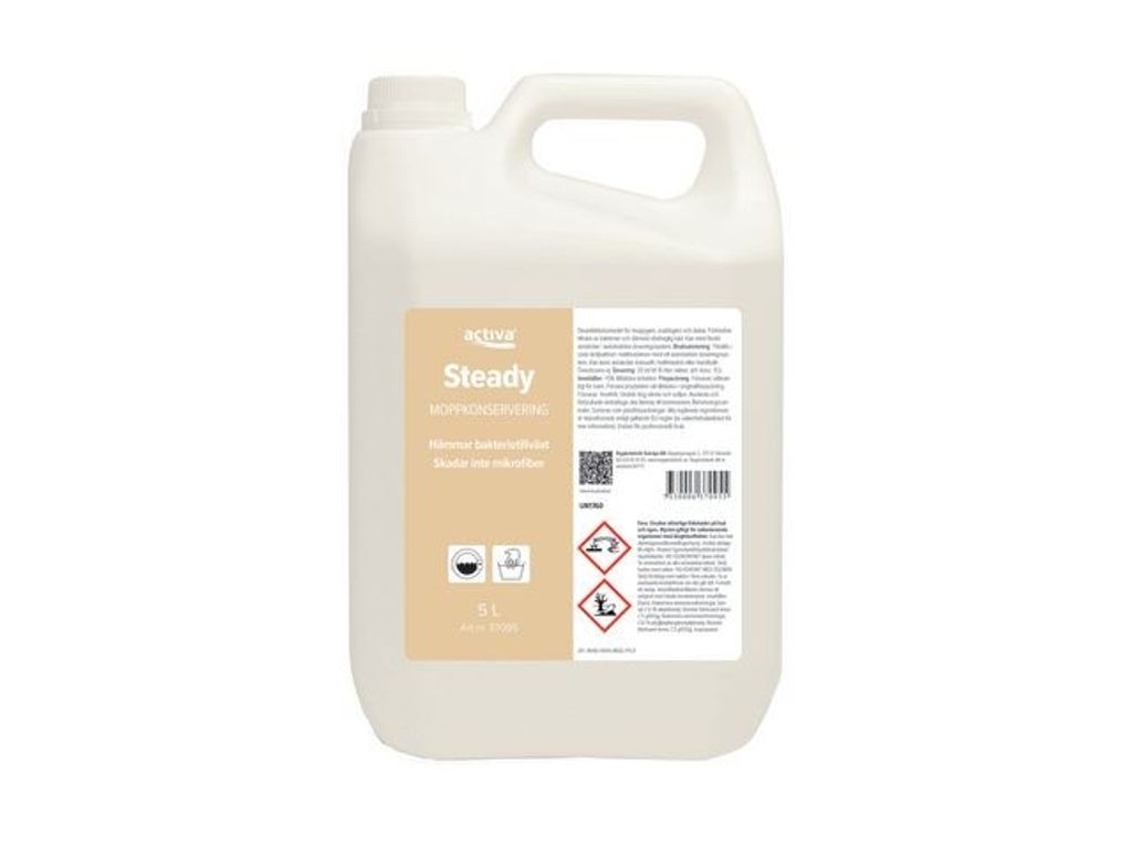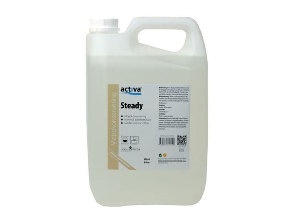 Activa Steady är ett desinfektionsmedel för moppgarn och svabbgarn som förhindrar tillväxt av bakterier och därmed också obehaglig lukt. Långtidsverkande. Kan med fördel användas i automatiska doseringssystem. - pH-värde: 7 - Dosering: 20ml till 10 liter vatten - Utseende: Färglös till Ljusgul vätska