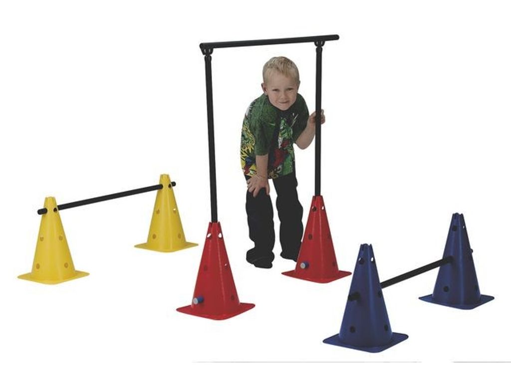 Med denna sats finns många möjligheter. Man kan bl.a. göra hinder att krypa under eller höj- och sänkbart hinder för att hoppa över. Innehåller 6 st koner (40 cm) med 13 hål, 4 st stavar 95 cm, 2 st stavar 25 cm, 1 st stav/ribba 120 cm, 2 st låskopplingar och 2 st vridkopplingar. - Tillverkade i Sverige