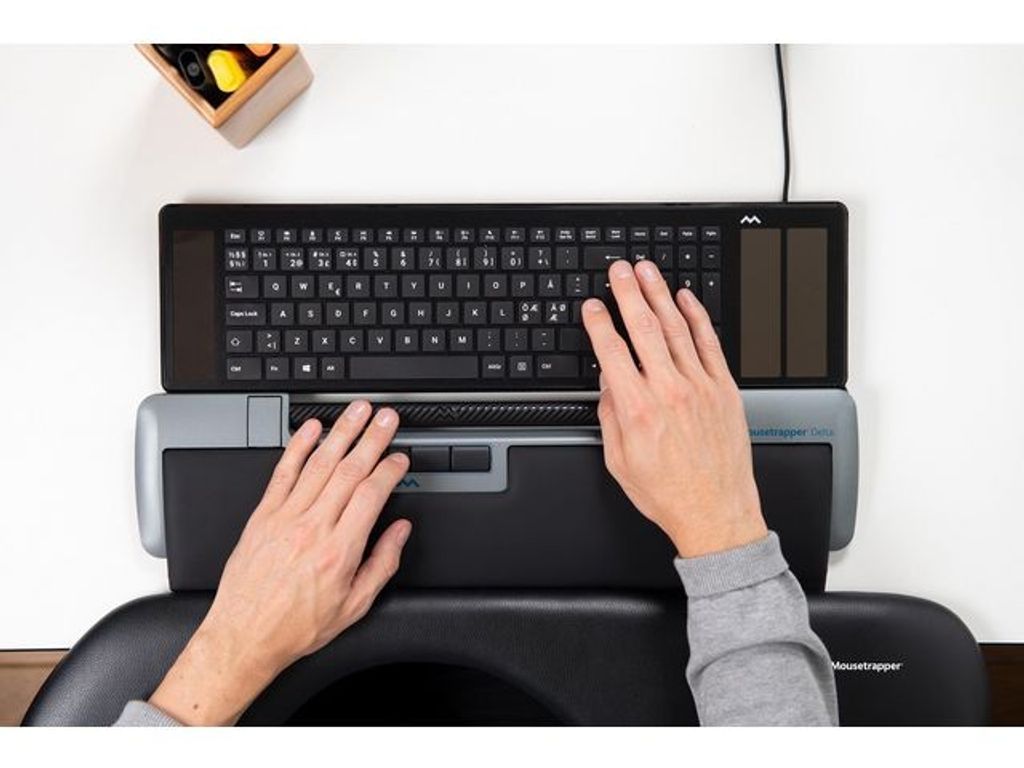 Ta kontroll över din arbetsplats med Mousetrapper Delta Extended – överlägsen ergonomi för längre och mer produktiva dagar! Delta styr du med en rullstav i kolfiber, Control Bar. Control Bar hjälper dig att jobba avslappnad och centrerat framför datorn och med sex anpassningsbara knappar får du stöd för att arbeta effektivare. Delta är tillverkad i Sverige och dessutom gjord av återvunnen plast. Dess breda, unika Control Bar i kolfiber har en mjuk struktur som hjälper dig att arbeta exakt och effektivt. Längden är anpassad för att göra Control Bar lättillgänglig när du använder hela tangentbordet, oavsett storlek. Upplösningen på 4000 dpi gör det enkelt att rulla, klicka och zooma och ger dig en enastående precis känsla när du arbetar. De sex programmerbara knapparna ger dig frihet att skapa kreativa genvägar som gör arbetet enklare. Det är lätt att ändra knapparnas funktioner via MT Keys. Delta har en USB-hub för att ladda och ansluta andra enheter. Prova gratis i 14 dagar! Fler och fler av oss spenderar hela dagen framför datorn. Vi rör oss för lite och sitter för mycket i statiska positioner som vi inte är skapade för . Många kämpar med smärta i armar, axlar och nacke. Testa kostnadfritt i 14 dagar. Använd länken nedan. https://mousetrapper.com/testa-i-14-dagar-lyreco/ - Produkten har stöd för att lägga in kortkommandon i Medspeech och TakeCare. Kontakta oss för med information. - Anslutning: Kabel - Delta styr du med en rullstav i kolfiber - Antal knappar: 6 programmerbara - Markörhastighet: 4000 dpi - Styrmatta med klick- och scrollfunktion - Ny scroll via knappar - Mjukt handlovsstöd som kan desinficeras - Handlovsstödet är lätt att byta ut med sin magnetiska infästning - Justerbar höjdanpassning med utvikbart friktionsbelägg - 2 USB portar (3,3V) för att ladda och ansluta ytterligare enheter - Tillverkad i återvunnen plast - Kompatibel med PC och MAC - Mått (LxBxH): 50 x 14,5 x 2,7 cm - Garanti: 2 år