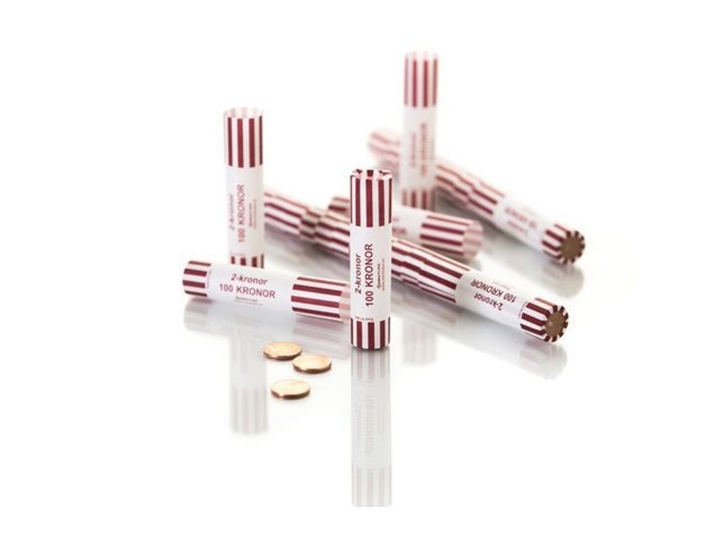 Mynthylsor för svenska 2 kr mynt (2016). Hylsorna är är lätt koniskt formade och har en speciellt utformad bottendel. Detta möjliggör effektiv användning i en myntsorteringsmaskin, där mynten automatiskt faller ner i myntröret ordentligt, men också effektiv lagring i att de tomma myntrören kan staplas för att minimera lagringsutrymme. Myntrören är märkta med vilken mynt-typ de ska innehålla samt kvantitet och vikt av ett fyllt rör. Varje förpackning innehåller 900 st mynthylsor.