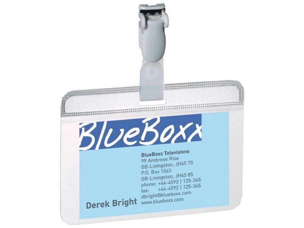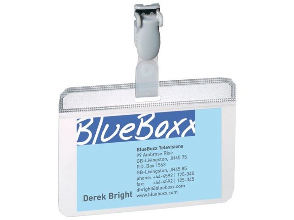 Självlaminerande namnskylt, Durable®. Namnskylt för instick eller visitkort upp till 9 x 5,4 cm som sätts fast med klämma på kort rem. Namnskylten hänger alltid i rätt position tack vare den vridbara plastklämman. Avlägsna skyddsfilmen från den självhäftande framsidan, placera visitkortet/insticket mot baksidan och försegla namnskylten genom att bestämt trycka ner framsidan. - Självlaminerande namnskyltar - - Med klämma på kort rem - - Med vridbar plastklämma