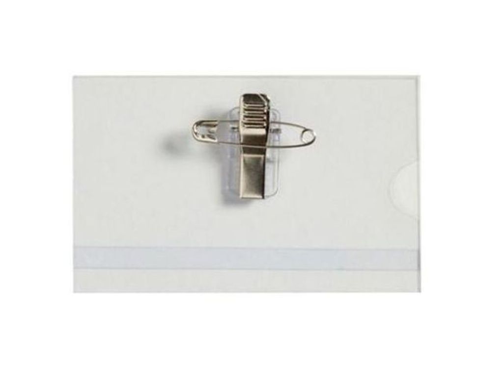 Beskrivning av Namnskylt LYRECO m.kläm/nå 40x75mm 50/fp Namnskylt av transparent PVC för 7,5 x 4 cm instick. Sätts fast med säkerhetsnål eller klämma. Instick medföljer.