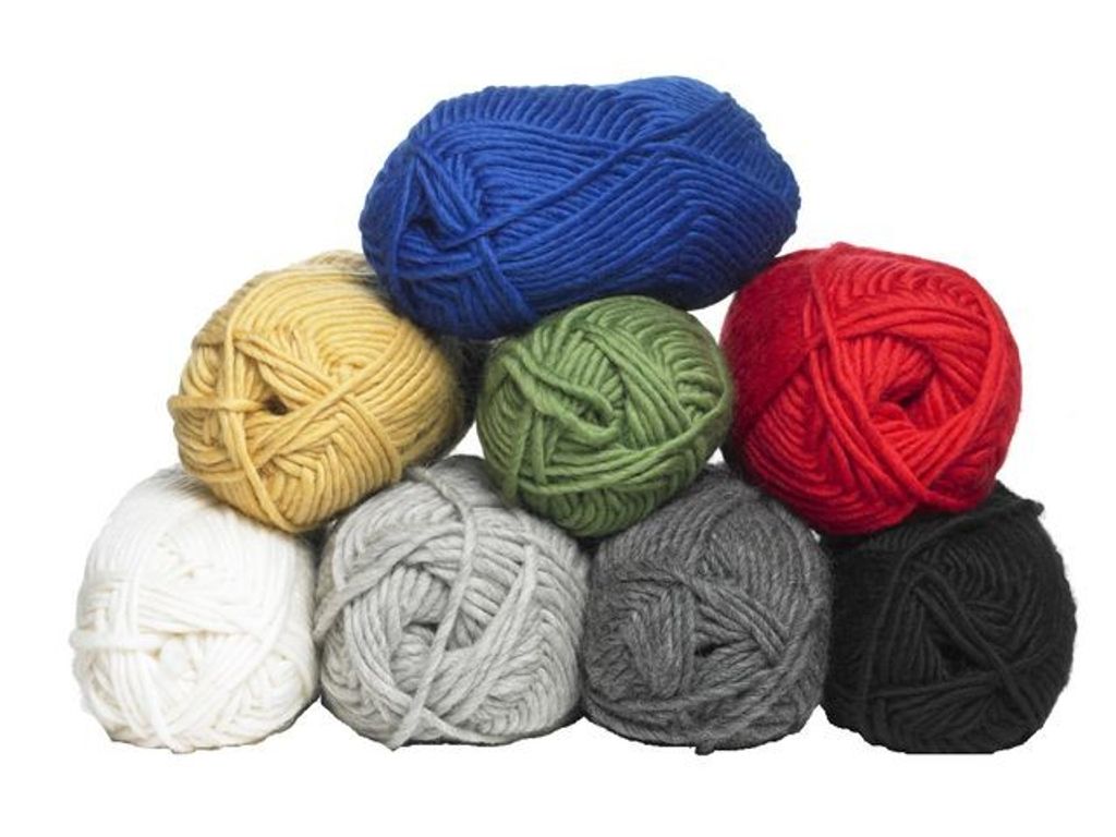 Garn av 100% ull. Förpackning innehåller färgerna: svart, ljusgrå, mörkgrå, naturvit, röd, blå, grön och gul. - 100% ull - 100 gram per nystan - 100 m per nystan - Går att tova i tvättmaskin i 40 grader - Rekommenderade stickor: nr 6-7