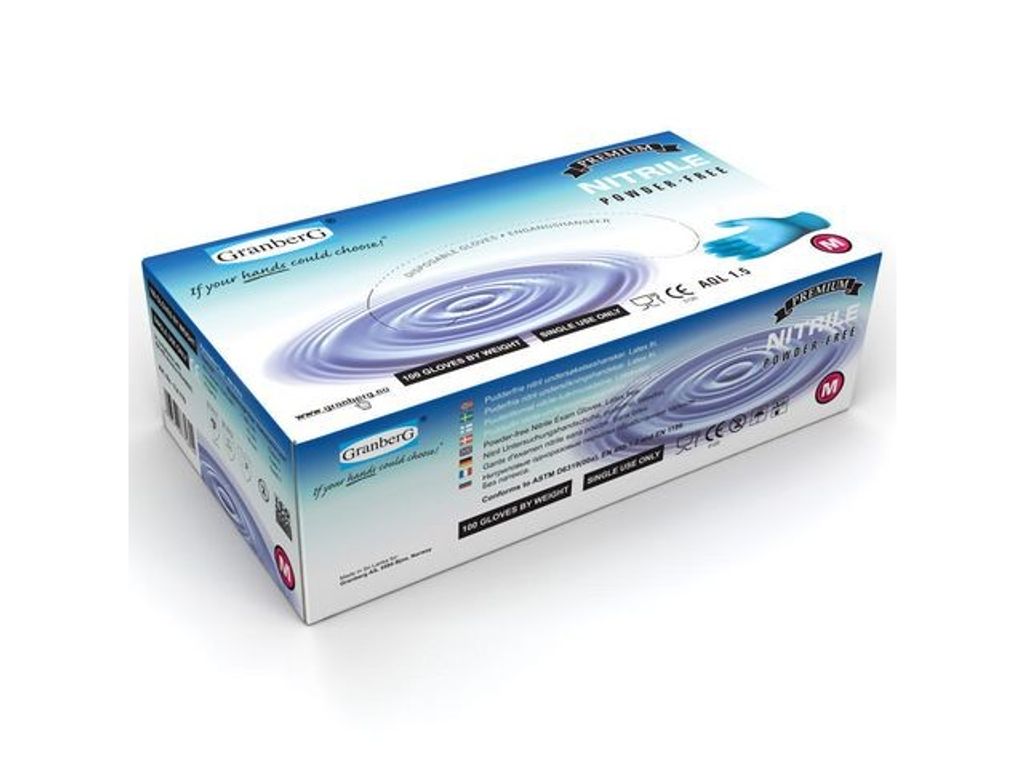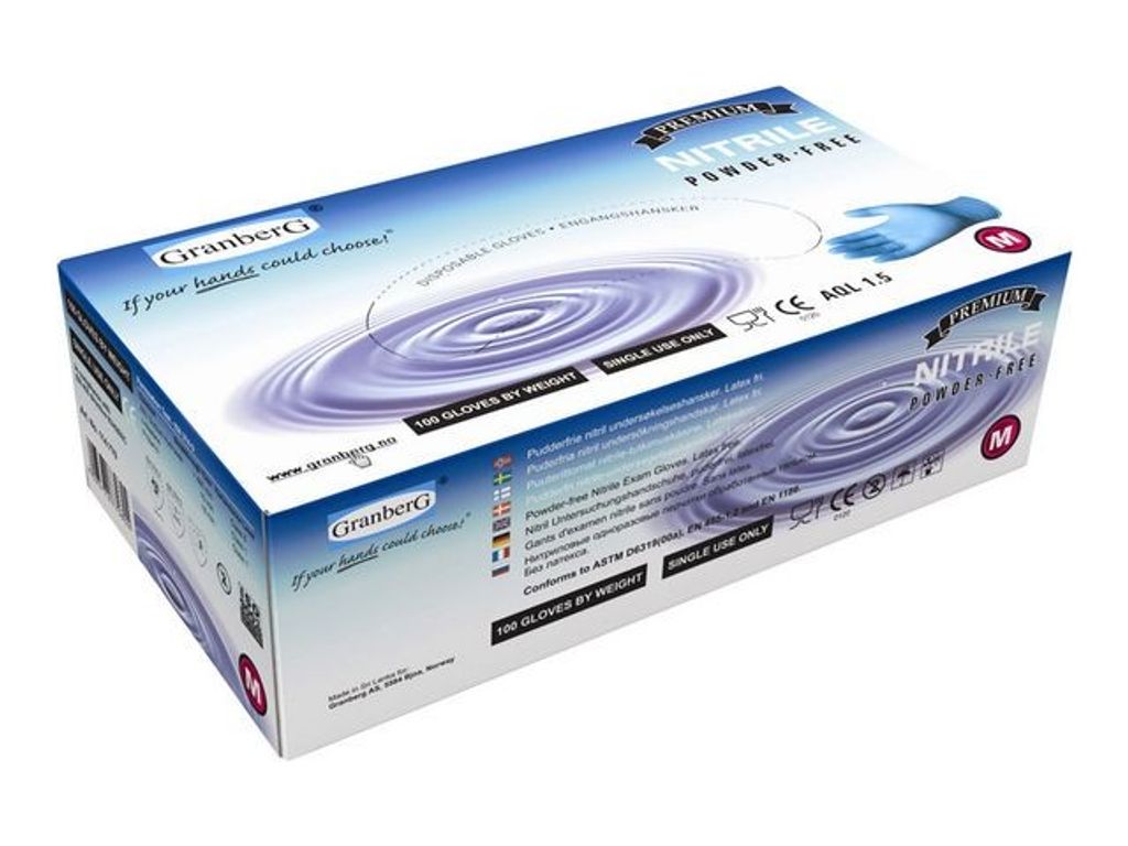 Kemikalieresistenta nitrilhandskar, godkända för användning med direkt kontakt med alla typer av livsmedel, inklusive livsmedel med hög fetthalt. Puderfria engångshandskar som är starka och elastiska. Med en mikroruggad ytstryktur på fingertopparna för bättre grepp. Lämpliga för arbete inom HoReCa, livsmedelsindustri, tillverkningsindustri, säkerhet, butik, underhåll, anläggning, kemikaliehantering (enligt test) samt rengöring. - Godkända enligt: EN 1186, EN ISO 21420:2020, EN 374:2016, ISO 18889:2019 - AQL: 1,5 - Skyddskategori: III - Vikt 5,8 ± 0,2g - Tjocklek: 0.12 ± 0.02mm (handflata) - Material: nitril - Färg: blå - Längd: 24cm - Storlek: XL - CE-certifierad - Livsmedelsgodkända - Puderfria - Vattentäta