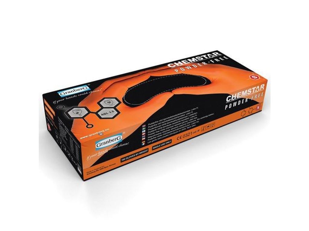 Puderfria, kemikalieresistenta handskar i nitril för engångsbruk. Livsmedelsgodkända. Starka och elastiska nitrilhandskar med en mikroruggad ytstruktur för bättre grepp. De är extra långa och har en hög synbarhet tack vare sin starka färg. Kemikaliresistenta samt vattentäta och godkända för användning i direkt kontakt med alla typer av livsmedel, inklusive livsmedel med hög fetthalt (EN 1186). Även godkänd för medicinsk användning (EN 455). Hndskarna lämpar sig för arbete inom medicin, kemisk industri, tillverkningsindustri, underhåll, kemikaliehantering (enligt test) samt rengöring. - Godkända enligt: EN 1186, EN 455, EN 374:2016, EN ISO 21420:2020, EN 421:2010 - AQL: 0,65 - Skyddskategori: III - Tjocklek: 0,11mm (handflata) - Matrial: nitril - Färg: orange - Längd: 27cm - Storlek: XXL - Livsmedelsgodkända - CE-certifierade - Puderfria