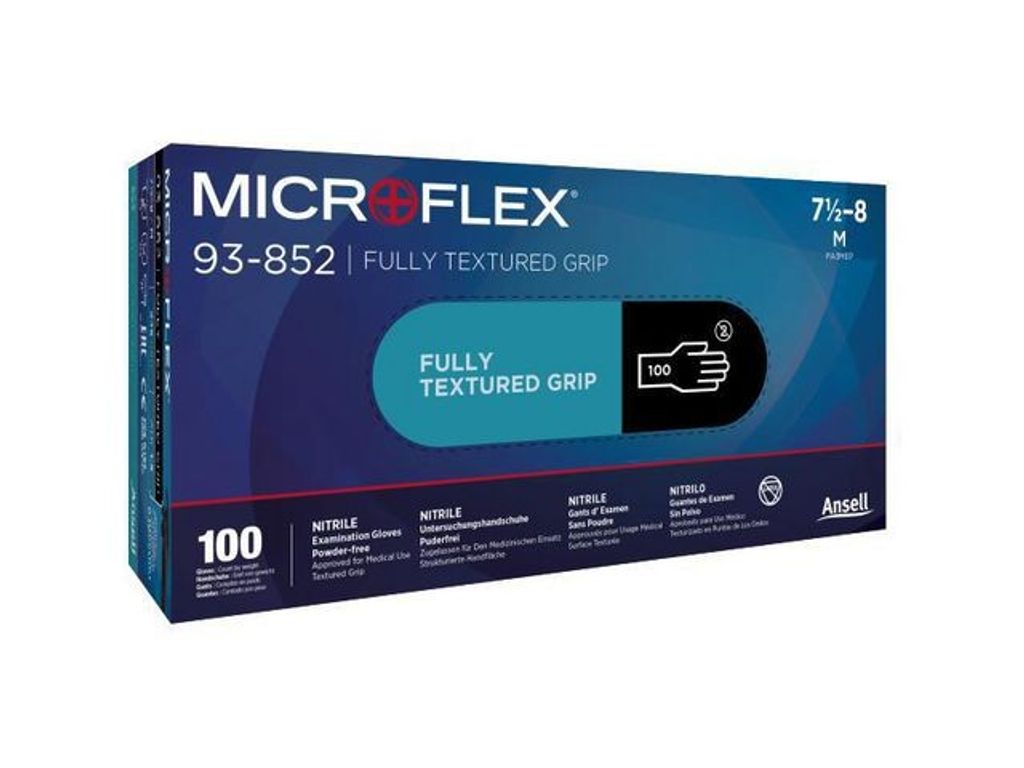 Puderfri nitrilhandske för engångsbruk med en distinkt svart färg som maskerar fläckar. Livsmedelsgodkänd. Nitrilhandske ANSELL 93-852 har en helt greppmönstrad design och en sammansättning som inte skummar vilket ger användaren ett fast våtgrepp vid hantering av föremål. Handsken har högre brottgräns än vad som krävs i standarderna ASTM D6319 och EN 455 och låter händerna röra sig fritt och bekvämt när användaren bär Microflex 93-852. Innehåller inte naturgummilatex och är puderfri för att skydda användaren mot typ I-hudallergier, hudirritation och torrhet. Passar för bl.a. användning av rengöringsverktyg och robotutrustning, reparation av motorer och drivlinor, provtagning av råmaterial, vägning och dispensering av fasta och flytande råmaterial. - Godkända enligt: EN ISO 374 2016, EN ISO 374-5 EN 420:2003 + A1:2009, EN 455 1-4 - AQL: 1,5 - Skyddskategori: III - Tjocklek: 0,12mm - Material: nitril - Färg: svart - Längd: 24,5cm - Storlek: 9 - Livsmedelsgodkänd - CE-certifierad - Puderfri - Silikonfri