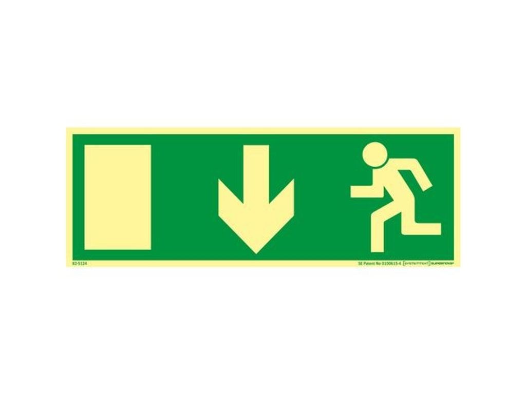 Nödutrymningsskylt pil ned Nödutrymningsskyltar i Supernova®, en patenterad teknik som gör att skylten i mörker visas med samma färger som i dagsljus eller i upplyst miljö. Lystiden är mellan 2-8 timmar och maximal lyseffekt uppnås efter 4 timmars laddning i belysning eller dagsljus. - Mått (BxH): 297x105mm - Material: Aluminium