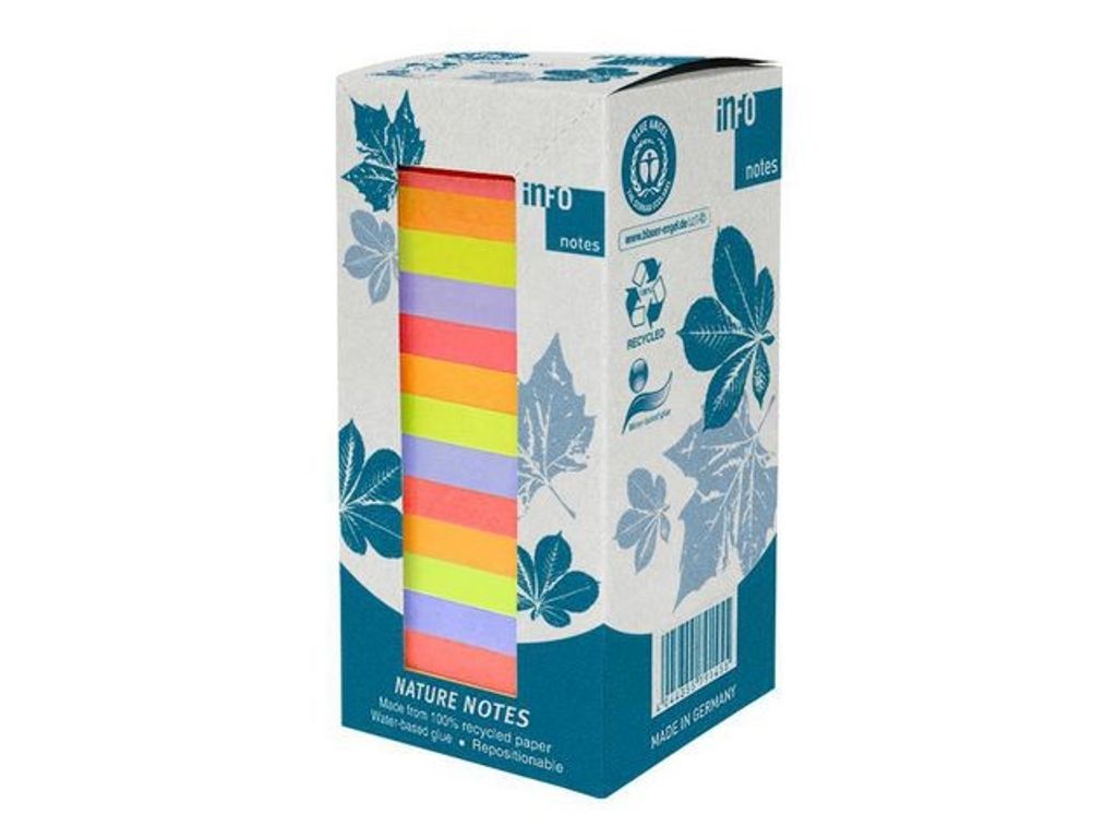 Info Notes tillverkade av 100% återvunnet papper i både notiser och förpackning. Gör snabba anteckningar eller lämna synliga kom-ihåg lappar, märk upp anteckningsblock och så mycket mer. Notiserna kan enkelt fästas och flyttas runt utan att skada underlaget. Dessa Info Notes är certifierade med Blue Angel av återvunnet papper. Häftmedlet är vattenbaserat och fritt från lösningsmedel. Blå Ängeln är en av de äldsta och mest prestigefyllda eko-certifieringarna i världen. - 100% fri från plast - Mått: 75x75mm - Antal block/fp: 16st - Antal blad/block: 100 - Antal färger: 4 (Gul, Orange, Rosa, Lila) - Antal blad/färg: 400 - Bredd limremsa: 25mm