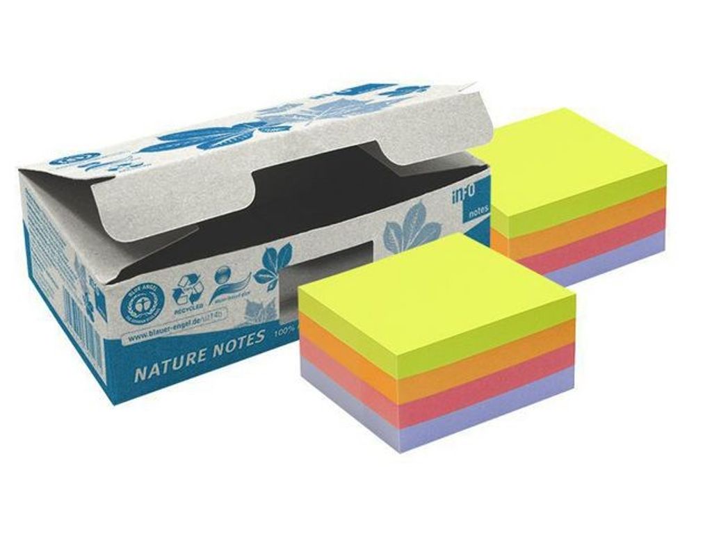Notes blad i fyra härliga färger som är gjort av 100% återvunnet papper. Det är 100 blad per färg och 400 blad per kub. De två kuberna är förpackade i en miljövänlig och återvunnen kartong och har ingen ytterligare förslutning. Limremsan på vardera blad är 25 mm. Dessa notes blad är certifierade med den Blå Ängeln. - 100% fri från plast - Mått: 75x75mm - Antal blad/färg: 100 - Antal blad/kub: 400 - Antal kub/fp: 2 - Antal färger: 4 (Gul, Orange, Rosa, Lila)