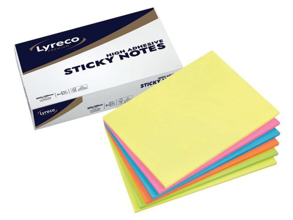 Lyreco Premium Notes är självhäftande notisar med extra starkt lim - perfekt för vertikala ytor. Färgrika notislappar i gult, rosa, blått, orange och grönt med extra god vidhäftningsförmåga som enkelt flyttas runt och fäster på svåra ytor. Blocken är tillverkade av FSC®-certifierat papper med vattenbaserat lim och kommer i en förpackning av återvunnen papp. Varje block består av 50 ark och mäter 200 x 150 mm (BxL). - Innehåller 6 block med 50 ark per block - Mått: 200x150mm - Vattenbaserat lim - FSC®-certifierat papper