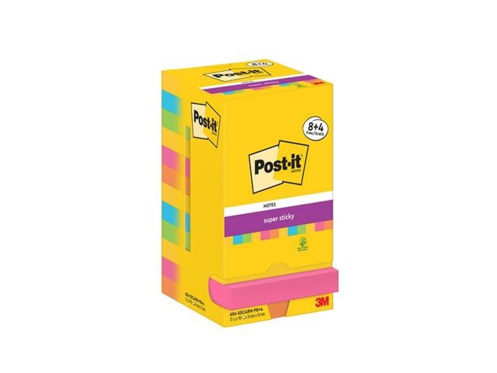 Post-it® Super Sticky Notes Carnival Collection 8 + 4 Extra block/förpackning Post-it® Super Sticky Notes är starkare och sitter kvar längre. De har dubbelt så stark häftförmåga som Post-it® Original Notes, så att du kan vara säker på att ditt meddelande når fram. De här självhäftande notes är perfekta för små anteckningar eller meddelanden och påminnelser. De finns i starka och sprakande färger och är superstarka, superflexibla och designade för att dina meddelanden ska synas. Tillverkade av PEFC-certifierat papper från certifierade, förnybara och hållbart förvaltade skogar, med ett häftämne av ett förnyelsebart material som till 60 % kommer från en växt som växer upp igen varje år. Förpackningen tillverkad av återvunnen wellpapp och kan användas som hållare för blocken. Perfekta för lodräta eller svåra ytor som datorskärmar, dörrar och väggar. Post-it® Super Sticky Notes tillverkas av PEFC-certifierade pappersfibrer, som kommer från hållbart skogsbruk och kontrollerade resurser Tillverkas med ett häftämne från av ett förnyelsebart material som till 60 % kommer från en växt som växer upp igen varje år. - Storlek: 76x76mm - Antal ark: 90 blad/block - Antal block: 12st per förpackning - Häftmedel: växtbaserat lim anpassat till vertikala ytor - Förpackning material: återvunnen wellpapp - tillverkas av PEFC-certifierade pappersfiber