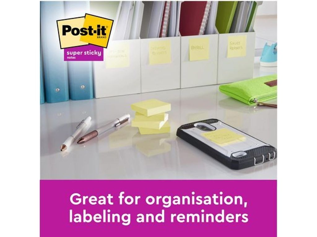 Post-it® Super Sticky 100 % Recycled Notes Gul 76mmx76mm, 70 blad/block, 14 + 4 KOSTNADSFRIA block/förpackning Post-it® Recycled Super Sticky Notes är tillverkade av 100 % återvunnet papper och är återvinningsbara. Dessa självhäftande notes är perfekta för att göra anteckningar eller lämna meddelanden och påminnelser på. Super Sticky Notes har dubbelt så stark häftförmåga som Post-it® Original Notes därför passar de till vertikala och ojämna ytor så att du kan fästa dem där du behöver dem. Dessa självhäftande notes är PEFC RECYCLED-certifierade och tillverkas av råvaror från certifierade, förnybara och hållbart förvaltade skogar. De har ett häftämne som tillverkas av en förnybar resurs, som till 60 % kommer från en växt som växer upp igen varje år. - Förpackningen tillverkad av återvunnen wellpapp kan användas för att enkelt förvara dina notes - Sitter bättre och längre tack vare dubbelt så stark häftförmåga jämfört med Post-it® Original Notes - Perfekta för lodräta eller svåra ytor som datorskärmar, dörrar och väggar - 100 % återvunnet papper och är återvinningsbara - Tillverkade av PEFC-certifierade pappersfibrer, som kommer från hållbart skogsbruk och kontrollerade resurser - Häftämne från en förnybar resurs, som till 60 % kommer från en växt som växer upp igen varje år