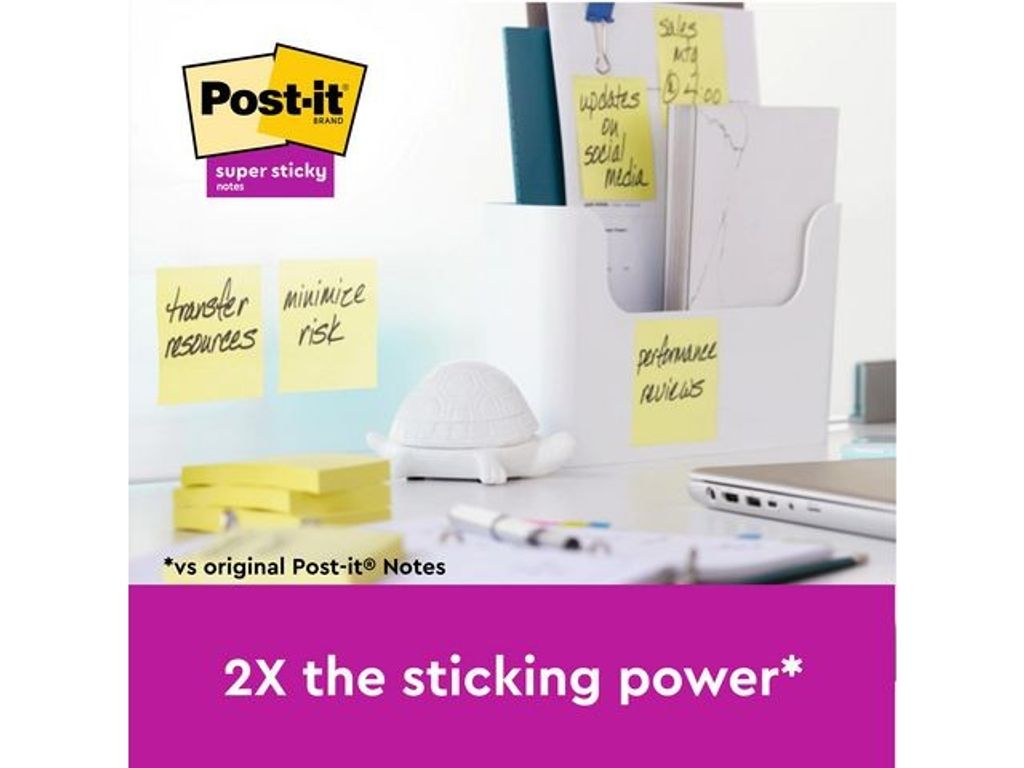 Post-it® Super Sticky 100 % Recycled Notes Gul 76mmx76mm, 70 blad/block, 3 block/förpackning Post-it® Recycled Super Sticky Notes är tillverkade av 100 % återvunnet papper och är återvinningsbara. Dessa självhäftande notes är perfekta för att göra anteckningar eller lämna meddelanden och påminnelser på. Super Sticky Notes har dubbelt så stark häftförmåga som Post-it® Original Notes därför passar de till vertikala och ojämna ytor så att du kan fästa dem där du behöver dem. Dessa självhäftande notes är PEFC RECYCLED-certifierade och tillverkas av råvaror från certifierade, förnybara och hållbart förvaltade skogar. De har ett häftämne som tillverkas av en förnybar resurs, som till 60 % kommer från en växt som växer upp igen varje år. - Förpackningen tillverkad av återvunnen wellpapp kan användas för att enkelt förvara dina notes - Sitter bättre och längre tack vare dubbelt så stark häftförmåga jämfört med Post-it® Original Notes - Perfekta för lodräta eller svåra ytor som datorskärmar, dörrar och väggar - 100 % återvunnet papper och är återvinningsbara - Tillverkade av PEFC-certifierade pappersfibrer, som kommer från hållbart skogsbruk och kontrollerade resurser - Häftämne från en förnybar resurs, som till 60 % kommer från en växt som växer upp igen varje år