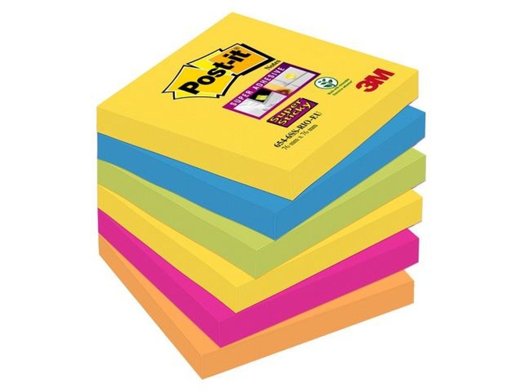 Post-it® Super Sticky-notislappar har ett starkt klister och fäster bättre på de flesta ytor än andra notislappar. Se till att dina anteckningar eller idéer syns med de här Post-it®-notislapparna. De är tillverkade av PEFC™-certifierade pappersfibrer och är ett miljövänligare val för dina anteckningar. Dessutom har lapparna ett extra starkt klister som är tillverkat av 60 % återvunnet material. Post-it®-notislappar är mycket mångsidiga och kan användas till mycket, från att snabbt skriva ner ett telefonnummer och en att göra-lista, till att anteckna idéer och lämna meddelanden till kollegor, vänner och familj. Med de flyttbara notislapparna kan du enkelt fästa, ta bort och flytta dina anteckningar utan att lämna märken på ytor som arkivskåp, dörrar och väggar eller inuti kalendrar, pärmar och anteckningsböcker. Varje block om 76 x 76 mm består av 90 Super Sticky-notislappar och levereras i en förpackning med 6 block i 5 olika klara färger, vilket gör dina idéer lite mer personliga och får dina anteckningar att sticka ut. - Starkare lim som fäster bättre - Tillverkade av PEFC™-certifierade pappersfibrer - Tillverkade av 60 % återvunnet material - Passar bra för telefonmeddelanden eller för att snabbt skriva ned anteckningar och påminnelser - Perfekta för att markera sidor eller anteckna i böcker och tidningar - Klara färger gör att meddelanden och påminnelser sticker ut - Håller sig alltid släta, lyfter inte och kryper inte upp - Varje block innehåller 90 blad - Mått: 76 x 76 mm - Olika färger: Neongrön, neonorange, blå, ultragul, ultrarosa - block