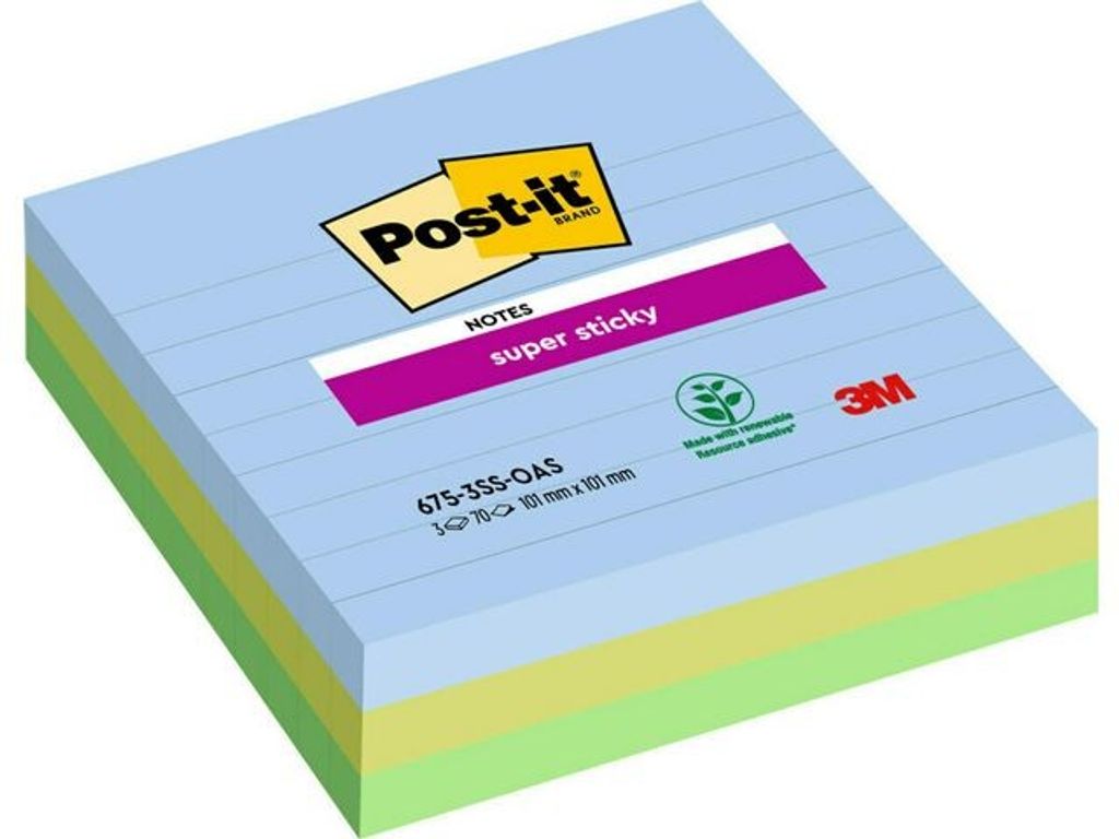 Perfekt för korta meddelanden eller påminnelser. Post-it® Super Sticky Notes, Oasis Collection, linjerade, 101 mm x 101 mm, 70 blad/block, 3 block/förpackning. Dessa självhäftande notes är perfekta för att göra anteckningar eller lämna meddelanden och påminnelser på. Super Sticky Notes har dubbelt så stark häftförmåga som Post-it® Original Notes därför passar de till vertikala och ojämna ytor så att du kan fästa dem där du behöver dem. - Linjerade - Mått: 101 mm x 101 mm - 70 blad/block - 3 block/förpackning