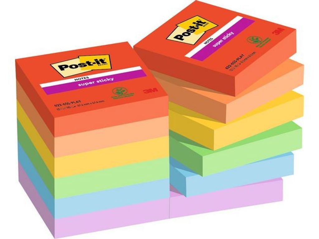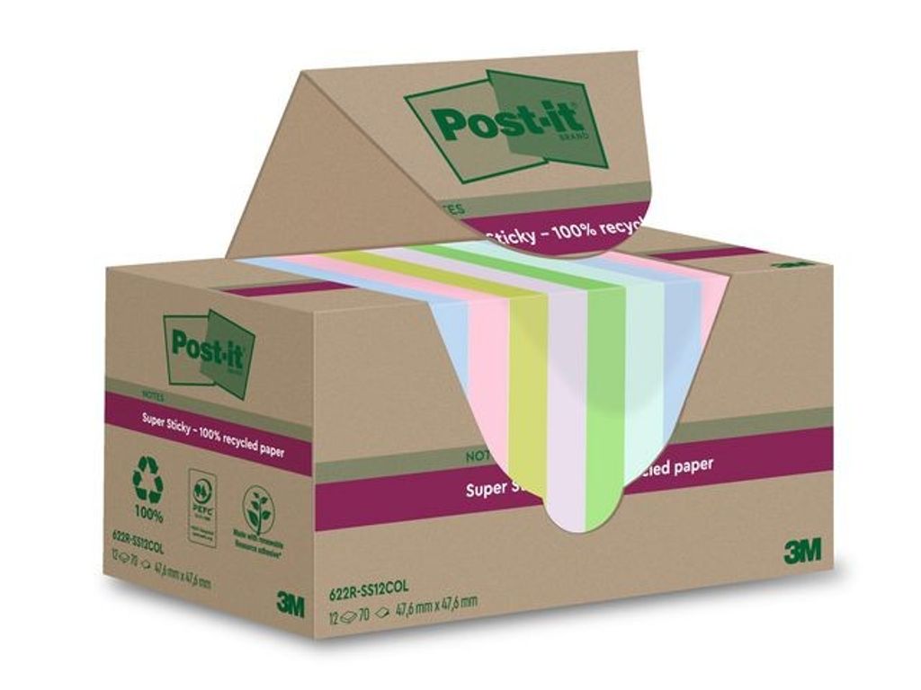 Post-it® Super Sticky 100 % Recycled Notes i sorterade färger, 47,6mmx47,6mm, 70 blad/block, 12 block/förpackning Post-it® Recycled Super Sticky Notes är tillverkade av 100 % återvunnet papper och är återvinningsbara. Dessa självhäftande notes är perfekta för att göra anteckningar eller lämna meddelanden och påminnelser på. Super Sticky Notes har dubbelt så stark häftförmåga som Post-it® Original Notes därför passar de till vertikala och ojämna ytor så att du kan fästa dem där du behöver dem. Dessa självhäftande notes är PEFC RECYCLED-certifierade och tillverkas av råvaror från certifierade, förnybara och hållbart förvaltade skogar. De har ett häftämne som tillverkas av en förnybar resurs, som till 60 % kommer från en växt som växer upp igen varje år. - Förpackningen tillverkad av återvunnen wellpapp kan användas för att enkelt förvara dina notes - Sitter bättre och längre tack vare dubbelt så stark häftförmåga jämfört med Post-it® Original Notes - Perfekta för lodräta eller svåra ytor som datorskärmar, dörrar och väggar - 100 % återvunnet papper och är återvinningsbara - Tillverkade av PEFC-certifierade pappersfibrer, som kommer från hållbart skogsbruk och kontrollerade resurser - Häftämne från en förnybar resurs, som till 60 % kommer från en växt som växer upp igen varje år