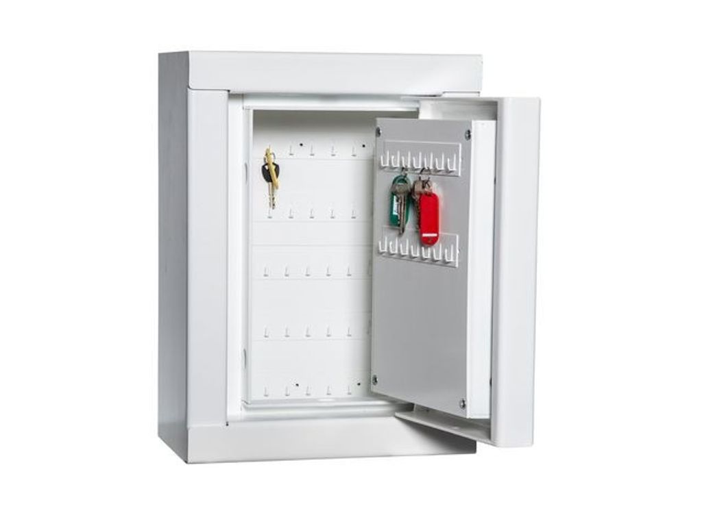 Beskrivning av Nyckelskåp HÅBECO 55 långa krokar Vägghängt nyckelskåp med 55 st långa krok, inbrottsklass SS3492. - Utvändiga mått 475x350x220 mm (HxBxD) - Vikt 40 kg - Elektroniskt kodlås går att få som tillval, art 219773.