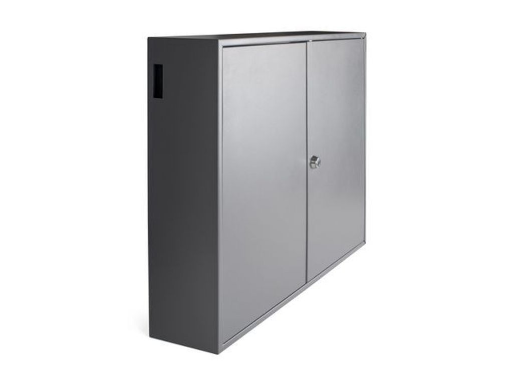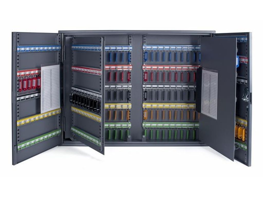 Pavo metall låsbart nyckelskåp för 300 nycklar Levereras med nyckelbrickor, självhäftande nummer, etikettbord och väggfästen. Har en unik returplats för nyckel för att returnera nycklar utan huvudlåset. - 300 nycklar - Grå - Mått BxHxD: 72x54x14 cm
