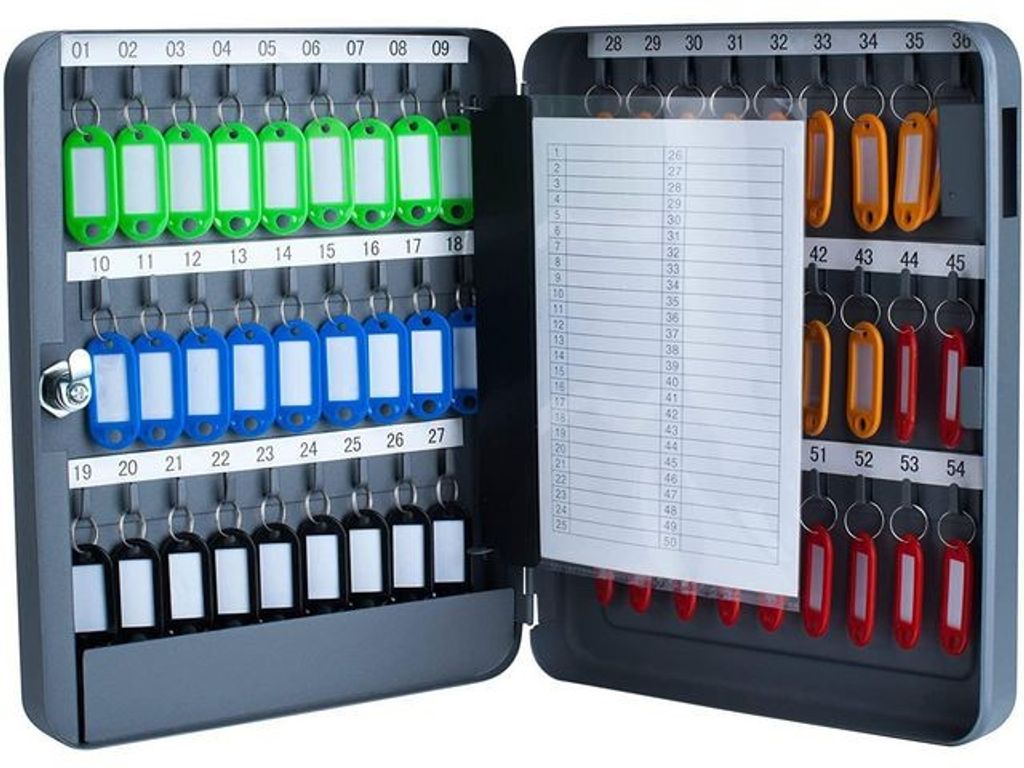 Pavo metall låsbart nyckelskåp för 54 nycklar. Levereras med nyckelbrickor, självhäftande nummer, etikettbord och väggfästen. Har en unik returplats för nyckel för att returnera nycklar utan huvudlåset. - 54 nycklar - Grå - Mått BxHxD: 24x30x6 cm - Vikt: 1,7 kg