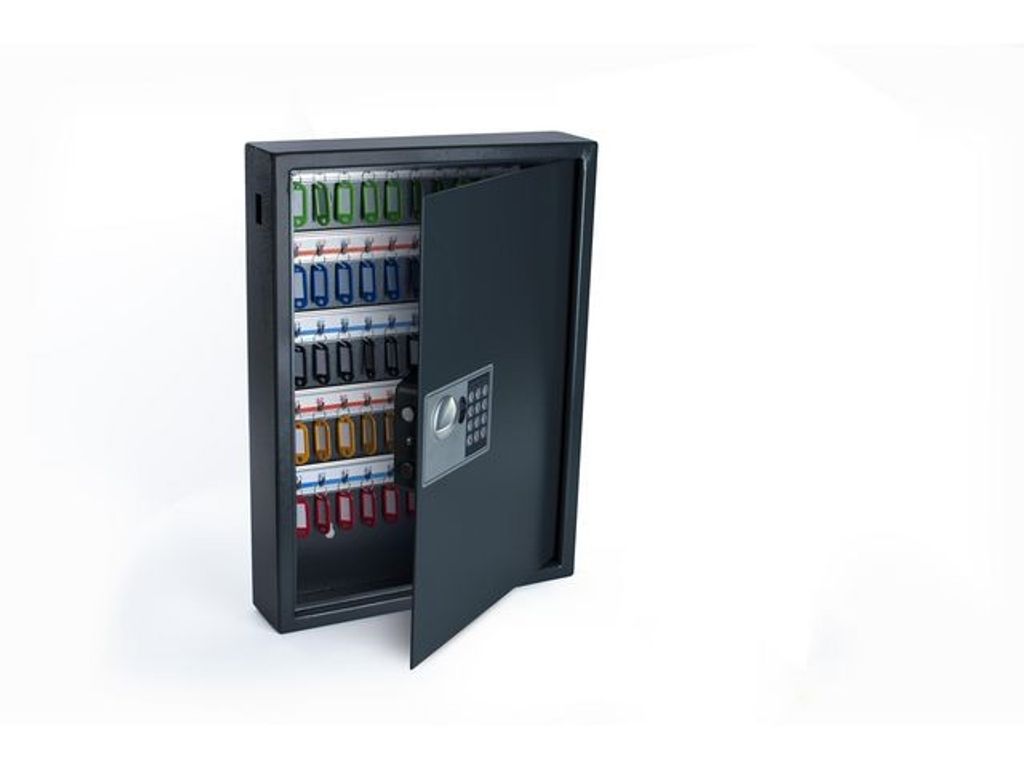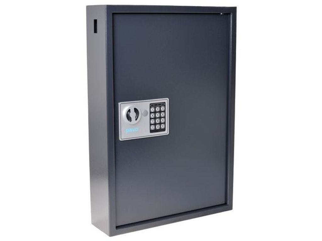 PAVO Högsäkerhet metall låsbart nyckelskåp för 100 nycklar Innehåller elektronisk knappsats med två nödknappar. 4MM dörr förtjockningar. Levereras med nyckelbrickor, självhäftande nummer, etikettbord och väggfästen. Har en unik returplats för nyckel för att returnera nycklar utan huvudlåset. - 100 nycklar - Grå - Mått BxHxD: 45,5x65,5x16,5 cm - Vikt: 18,4 kg
