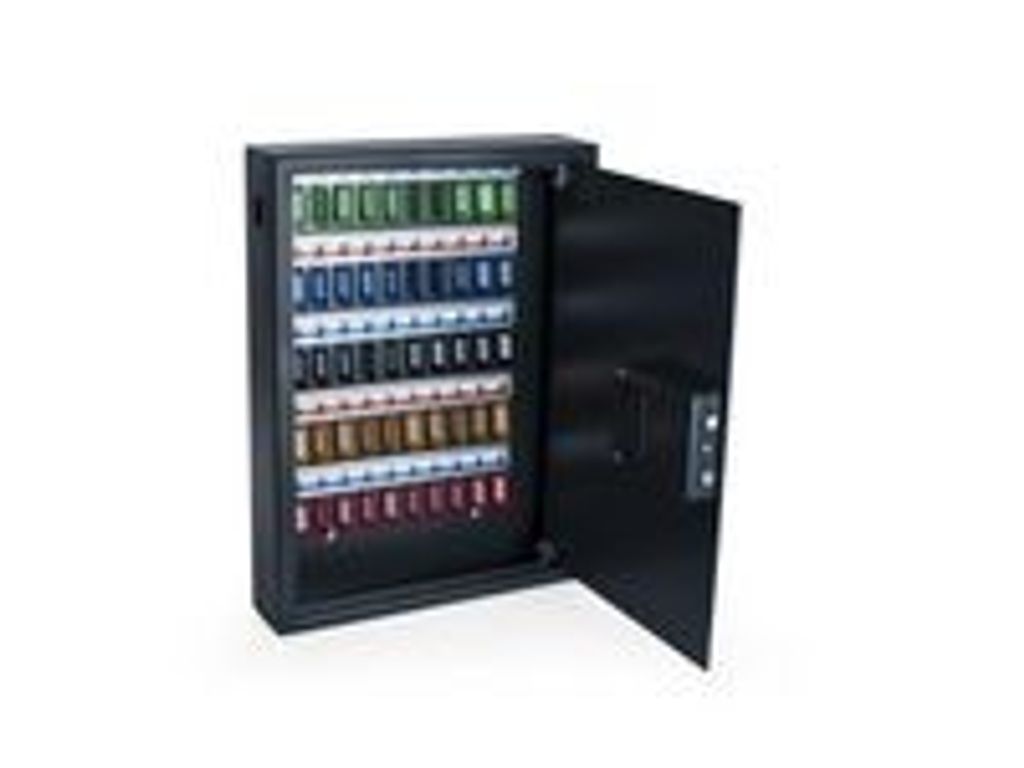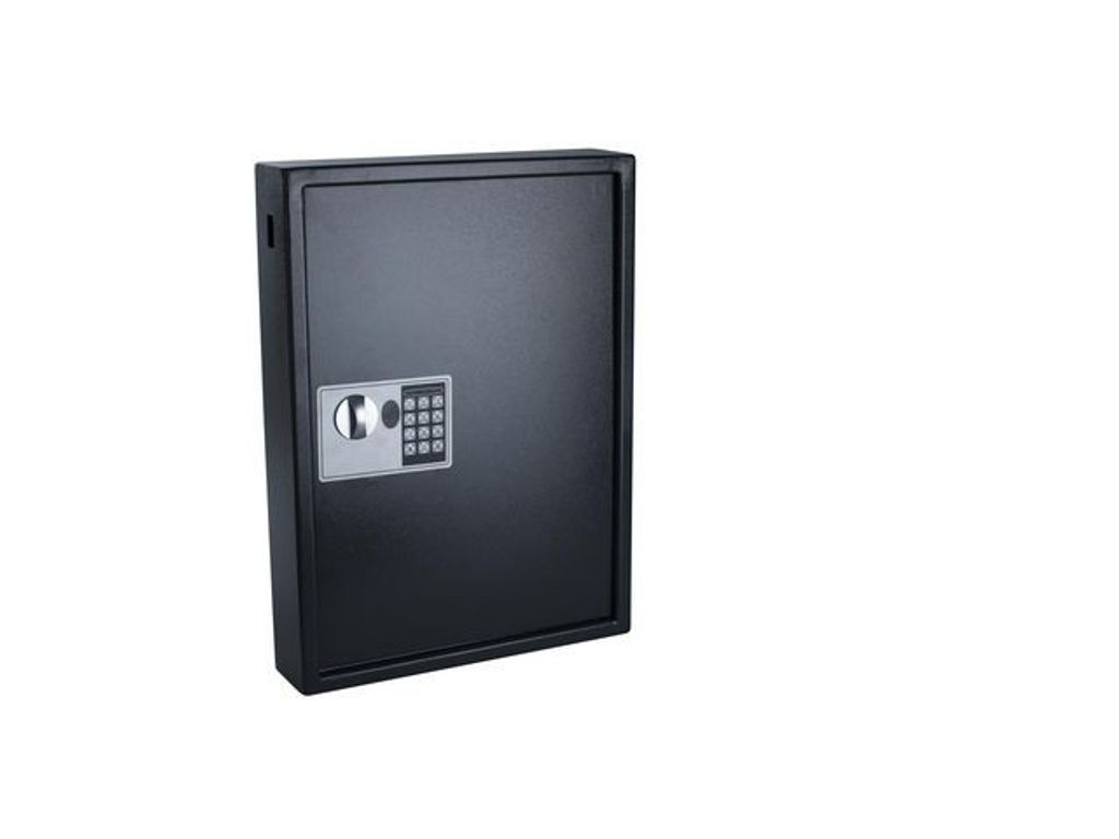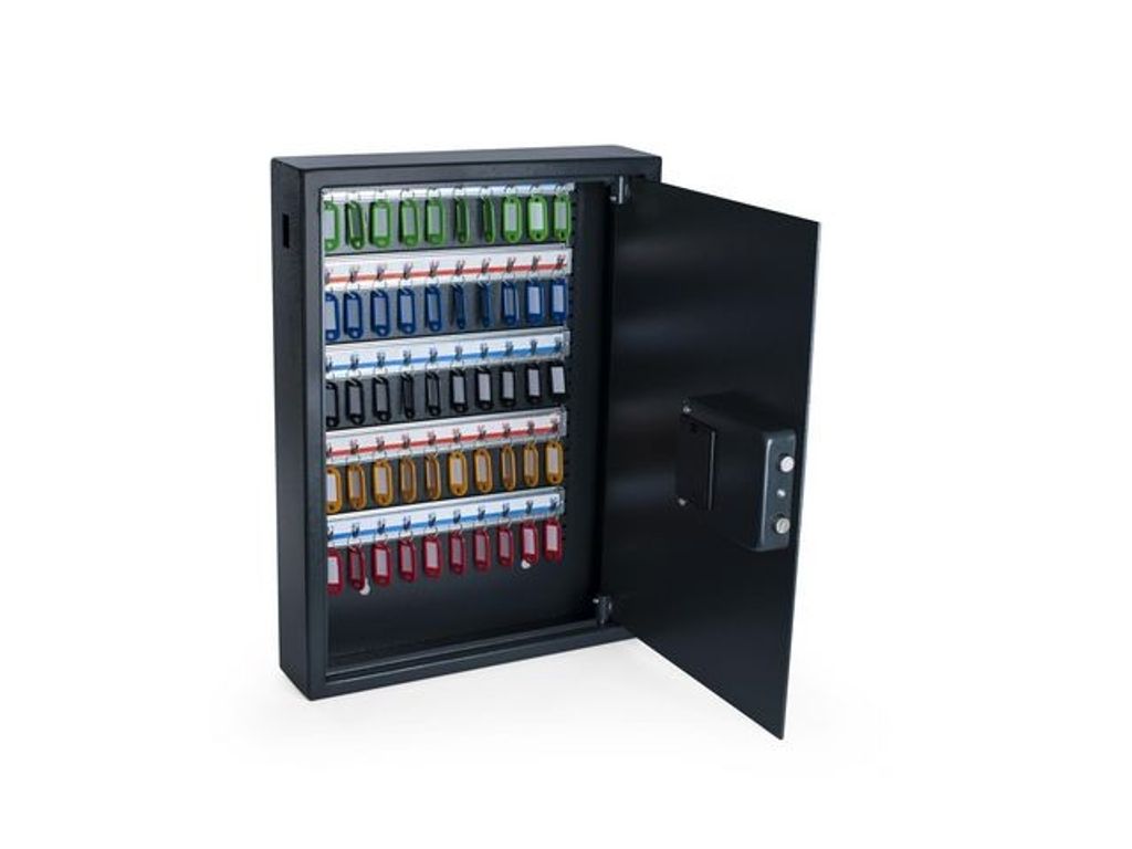 Pavo högsäkerhet metall låsbart nyckelskåp för 50 nycklar Innehåller elektronisk knappsats med två nödknappar. 4MM dörr förtjockningar. Levereras med nyckelbrickor, självhäftande nummer, etikettbord och väggfästen. Har en unik returplats för nyckel för att returnera nycklar utan huvudlåset. Går att öppna med en 'masternyckel' som ingår, om man glömt koden som man väljer till sitt skåp! - Djup: 100 mm - Bredd: 400 mm - Längd: 550mm - 50 nycklar - Grå