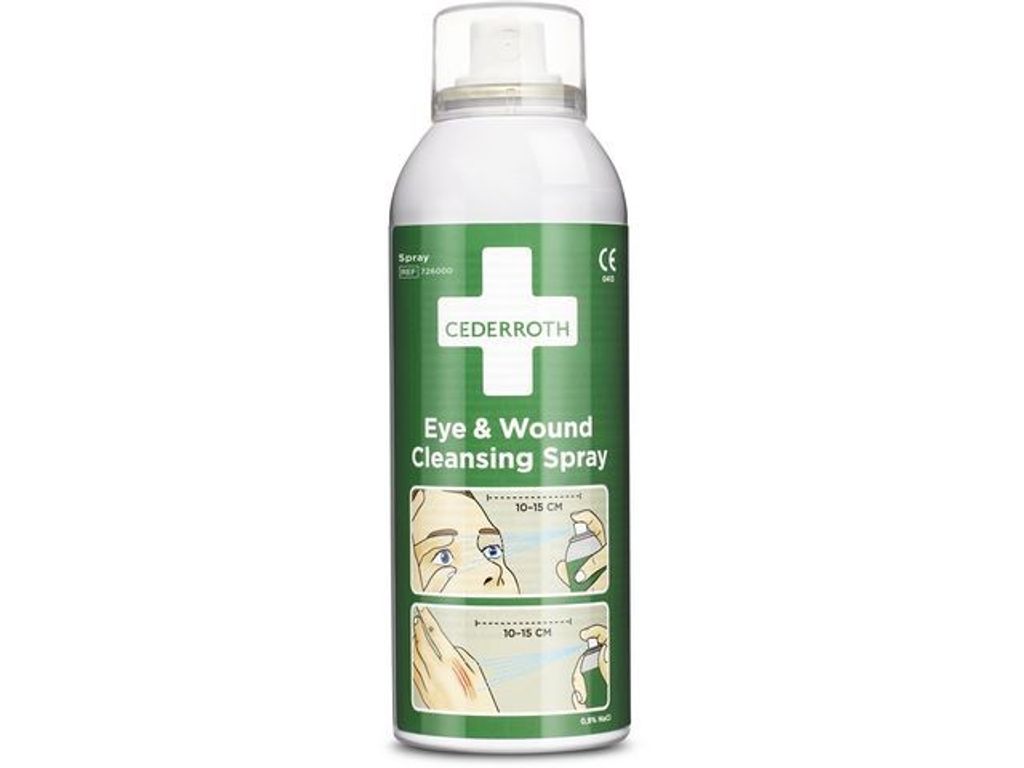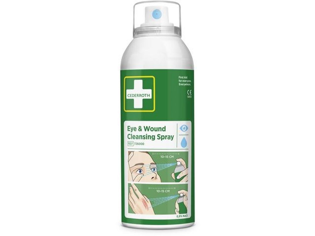 Spray för att rengöra och skölja bort damm och smuts ur ögon och sår. Passar i Första hjälpen-stationen. Sprayen ger ett mjukt vätskeflöde och har en total spoltid på 5 minuter, praktiskt för till exempel skrubbsår som behöver rengöras ordentligt. Sprayen kan användas flera gånger och är steril till sista droppen. Flaskans konstruktion gör att den kan användas i alla riktningar, även upp och nervänd. Den transparenta kapsylen har ett sigill som bryts vid första öppnandet Flaskan kan förvaras både stående och liggande. Vätskan i sprayflaskan förvaras i en innerpåse isolerad från drivgasen och blandas därför inte med den. Rengör munstycket före användning genom att spraya kort i luften. Spraya med ett avstånd på 10-15 cm från ögat eller såret. Undvik direktkontakt med munstycket. Trycksatt flaska som inte får utsättas för temperatur över 50°C. Får inte punkteras eller brännas, inte heller sedan innehållet förbrukats. Förvara i temperatur mellan 0°C och +40°C. - Kombinerad ögon- och sårtvätt - Passar i Första Hjälpen-stationen - Kan användas flera gånger - Steril till sista droppen - Innehåller 150 ml steril koksaltlösning, 0,9% NaCl. - Utan konserveringsmedel. - Drivgas: nitrogen. - Total spoltid 5 minuter. - OBS! Produkten ersätter inte ögondusch vid akuta ögonolyckor (exempelvis med stänk av frätande ämnen), men kan användas i steg 2 under transport till sjukhus efter initial sköljning.