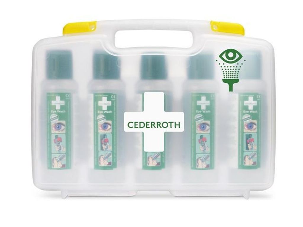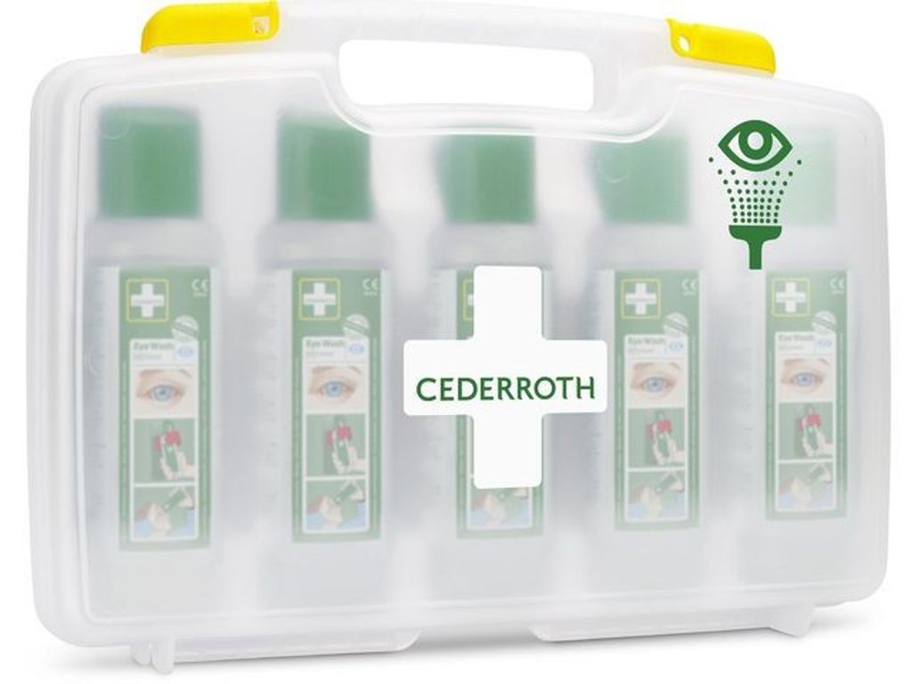 Praktisk väska innehållande 5x500ml ögondusch som är lätt att bära med sig vid exempelvis mobilt arbete eller under transport till sjukhus. Robust transparent väska av hårdplast med handtag. Lätt att öppna med gula rejäla spännen som skjuts i sidled. Kan hängas på väggen med vägghållare (REF 51011041). - Innehåll: - 5 st Cederroth Ögondusch (REF 725200) - Mått (bxhxd): 430x318x103 mm