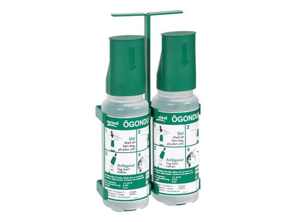 Sterisol ögondusch är ett tryggt komplement till fasta ögonduschstationer och passar utmärkt på rörliga arbetsplatser. Olyckor händer och även om de är sällsynta måste förutsättningarna för snabb och relevant hjälp vara optimala. Extra viktigt blir det när det kommer till ögonskador där vi ofta bara har en chans. Sterisol Ögondusch är en trygg lösning för säker ögonhälsa på arbetet. Ögonduschflaskan i 1 litersformat har en kontinuerlig spoltid på 12 minuter. Den kan enkelt placeras nära områden där det finns risk för stänk från farliga ämnen eller splitter från hårda material. För snabb och intuitiv tillgång kan de även förvaras i Sterisol Ögondusch 2-ställ eller väggfäste för fem flaskor. Flaskan är lätt att ta ur stället eller väggfästet för att därefter spola ögonen väg till läkare eller en fast ögonduschstation. All vätska träffar ögat i ett kontinuerligt och jämnt flöde och har en snabb igångsättning – ett bestämt slag med handen på skyddshuven bryter säkerhetsförseglingen. När man hanterar alkaliska och andra frätande ämnen ska spolningsanordning finnas på armlängds avstånd. Är sedan 2022 MDR-certifierad. - Lång spotid - en av marknadens längsta spoltider med 12 minuter per flaska. - Helt steril produkt - en helt steril produkt i en flaska som med automatik ger ett jämnt spolflöde och tryck mot ögat. - En isoton koksaltlösning - ögonduschen har samma osmotiska värde (0,9%) som kroppen själv. - Ingen borat eller fosfat - CE-certifierad - Hållbarhet: 3 år (oöppnad flaska)
