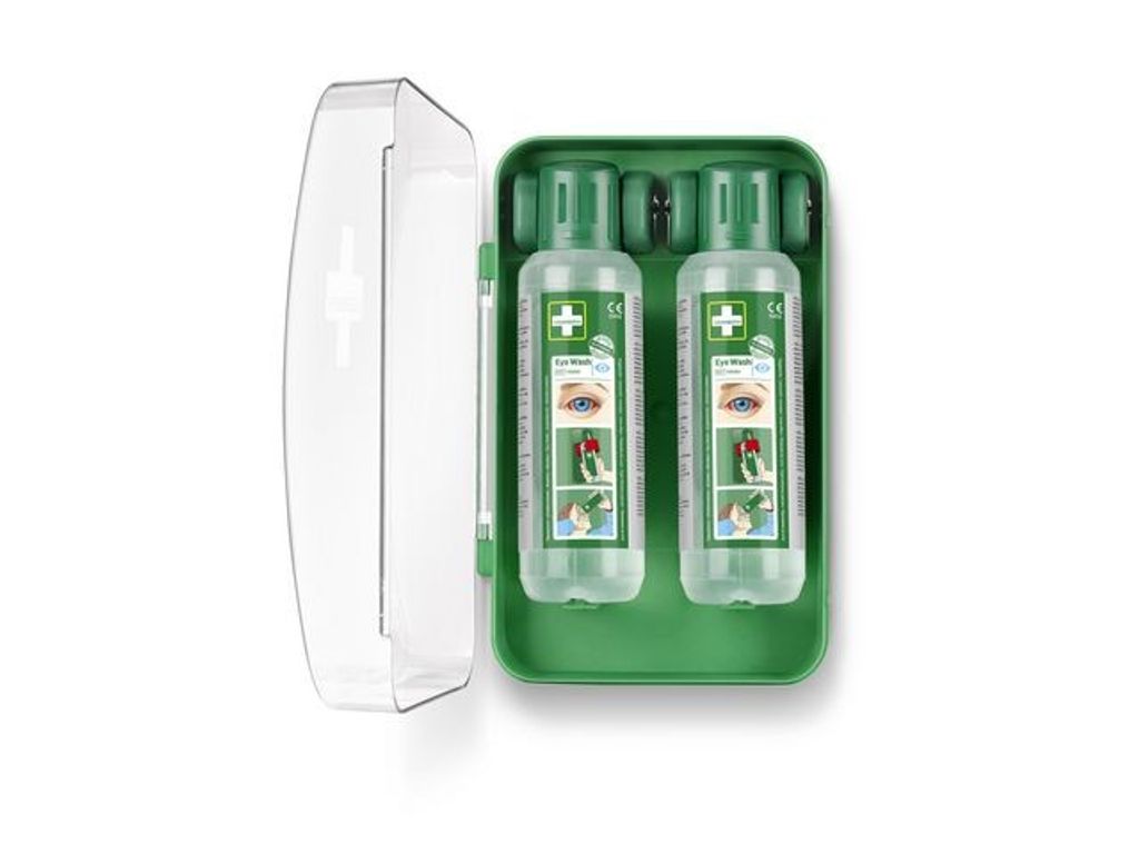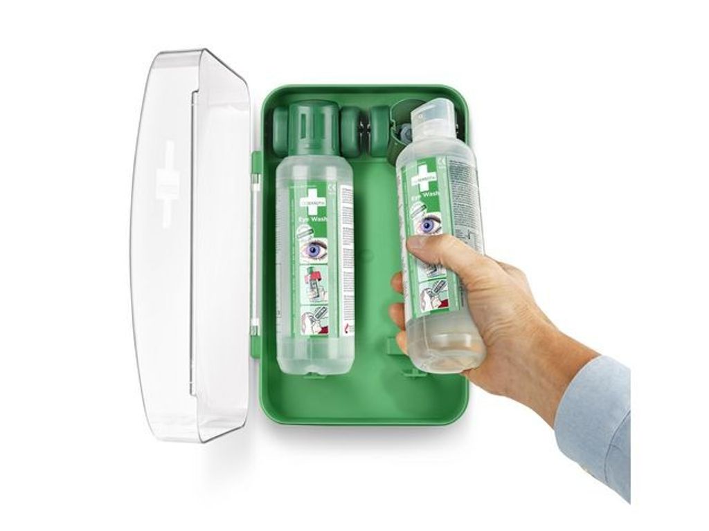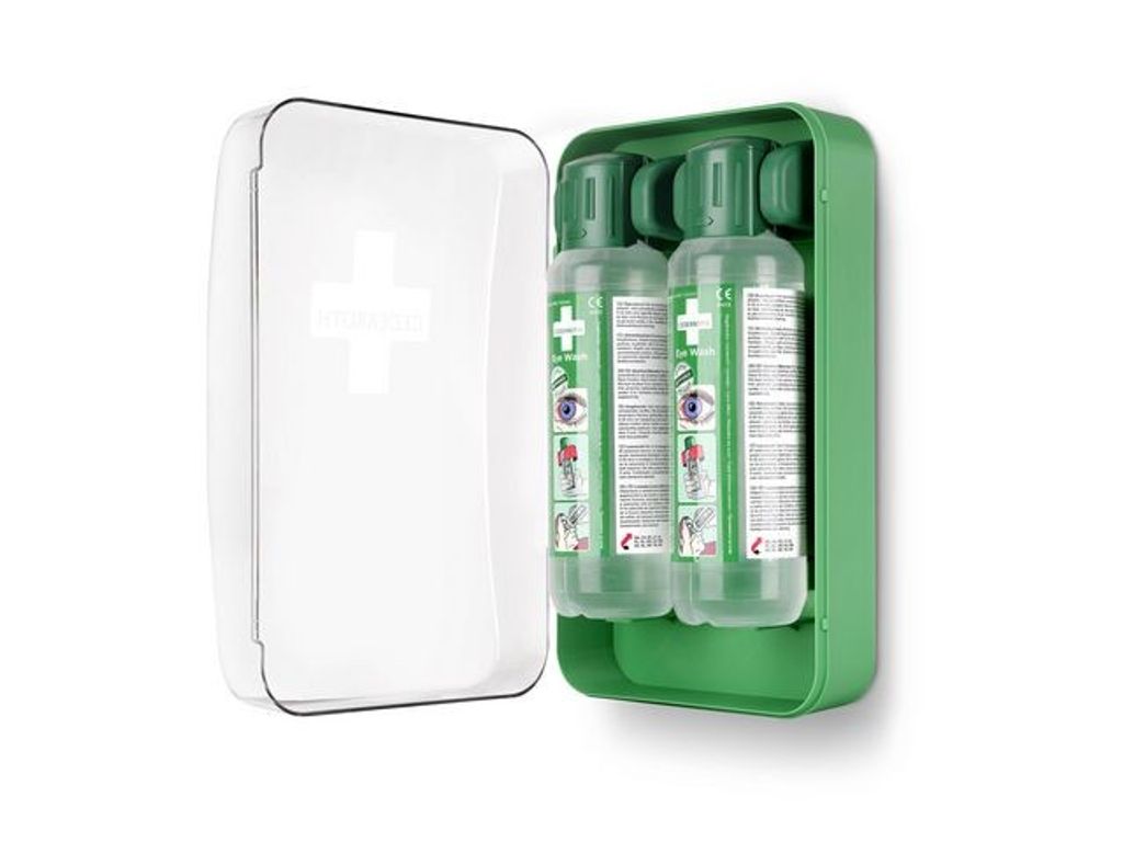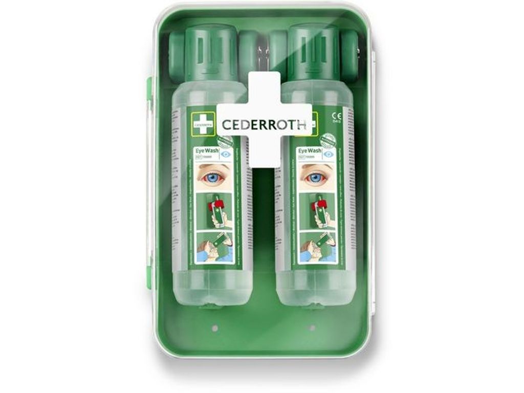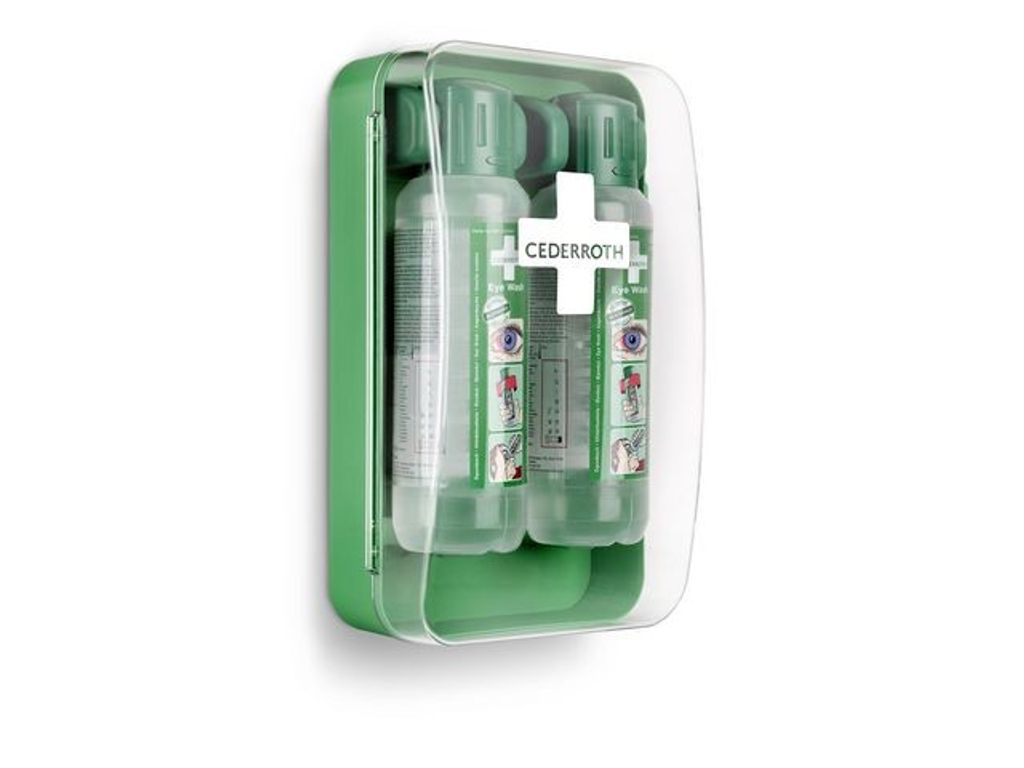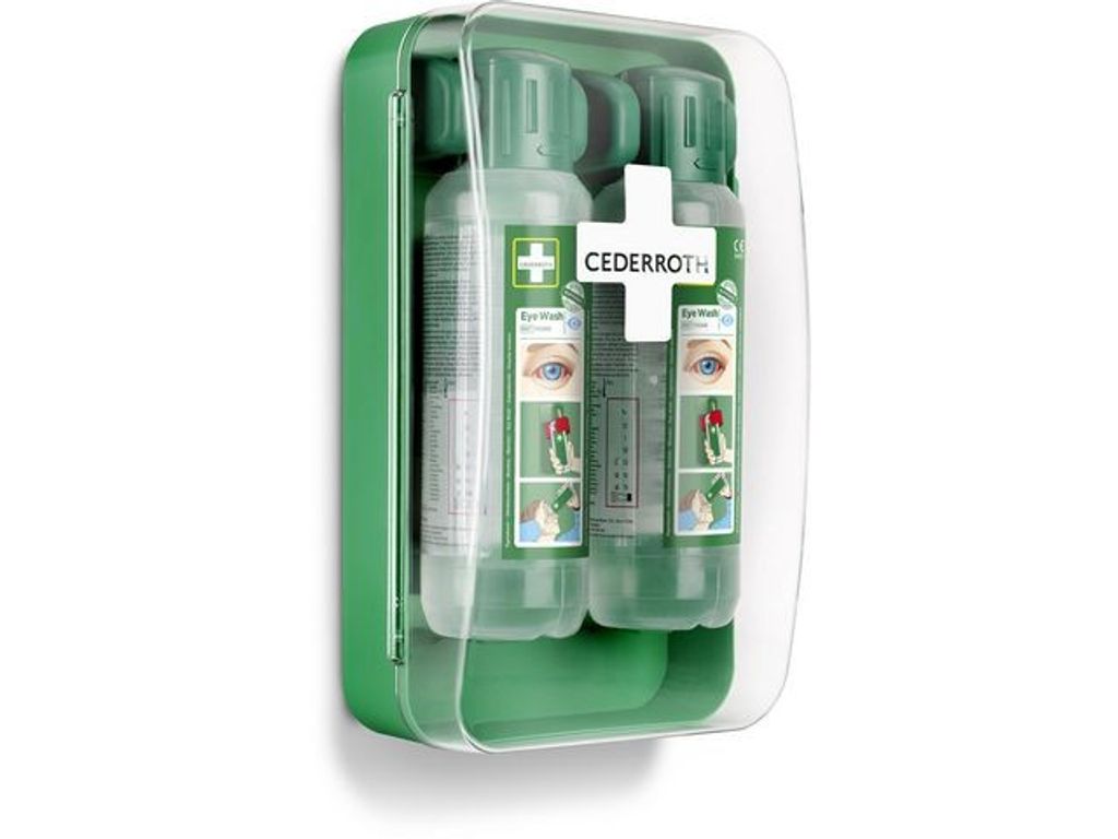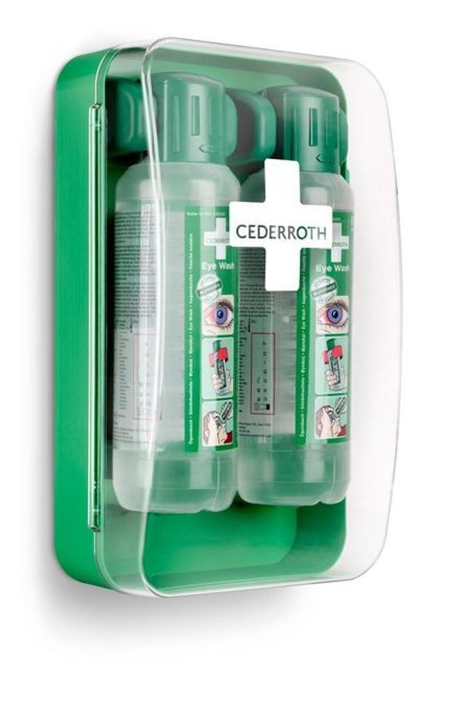 Ett kompakt ögonduschskåp som skyddar mot damm och vatten och som är lätt att få plats med även i mindre utrymmen. Flaskorna öppnas automatiskt när de vrids ur hållarna och sköljning kan påbörjas omedelbart. Cederroth ögondusch är avsedd för bortsköljning av både stänk av frätande alkalier och syror såväl som damm och skräp. Cederroths buffrade ögondusch har en neutraliserande effekt på stänk av alkalier och syror vilket ger snabbare resultat än en vanlig koksaltlösning. Effekten är generellt starkare på alkalier än syror. Perfekt för arbetsplatser som blir dammiga och smutsiga, för arbetsplatser med hög risk som behöver många flaskor eller när utrymmet är begränsat. Den grönfärgade plasten är gjord av >64% återvunnen plast. Med transparent lucka för hög synlighet. Innehåller:2 Cederroth Ögonduschflaskor à 500 ml (art.nr 725200) 1 Instruktionsskylt