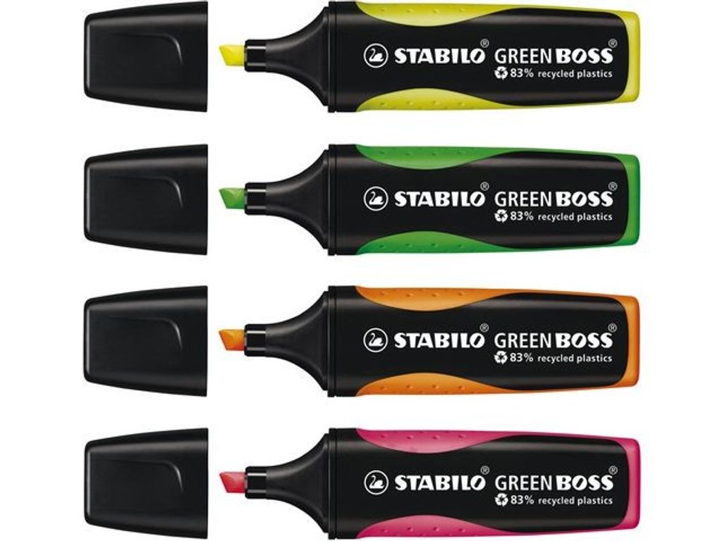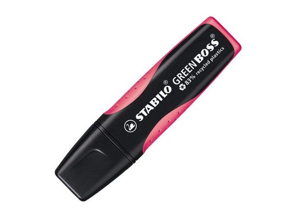 Markera viktig information med den miljövänliga överstrykningspennan STABILO® GREEN BOSS® som är tillverkad av 83 % återvunnen plast och har en Anti-Dry-Out-teknik. Överstrykningspennan STABILO® GREEN BOSS® är tillverkad av 83 % återvunnen plast och har ett tillförlitligt vattenbaserat bläck med Anti-Dry-Out-teknik så att korken kan vara av under 4 timmar utan att den torkar ut. Den kan användas på nästan alla typer av papper. Den har en mejselformad spets som ger dubbla linjebredder på 2 respektive 5 mm samt en bekväm greppzon så att du kan använda den i många olika sammanhang, till exempel för att skriva, stryka under eller markera. Överstrykningspennorna från STABILO® GREEN passar perfekt för miljömedvetna studenter och yrkesverksamma som måste läsa och markera viktig information i texter. Överstrykningspennan finns i ett antal olika attraktiva färger och har den klassiska BOSS®-formen med en platt pennkropp som inte rullar iväg. Tack vare den billiga bläckpåfyllningen kan du dessutom återanvända överstrykningspennan istället för att kasta den. - Överstrykningspennan är tillverkad i 83 % återvunnen plast - Ett miljövänligt val - STABILO® Anti-Dry-Out-teknik - Kan vara utan kork i upp till 4 timmar - Mejselformad spets med dubbla linjebredder på 2 respektive 5 mm - Kan markera text och innehåll på upp ca 375 m - Klassisk design med platt pennkropp - Vattenbaserat bläck - Färg: Rosa