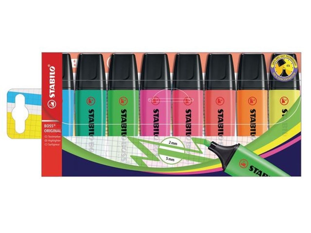 Markera text och viktig information med den klassiska överstrykningspennan STABILO® BOSS® ORIGINAL med Anti-Dry-Out-teknik. Originalöverstrykningspennan STABILO® BOSS® har ett tillförlitligt vattenbaserat bläck med Anti-Dry-Out-teknik så att korken kan vara av under 4 timmar utan att den torkar ut. Den kan användas på nästan alla typer av papper. Den har en snedskuren spets som ger dubbla linjebredder på 2 respektive 5 mm så att du kan använda den i många olika sammanhang, till exempel för att skriva, stryka under eller markera. Överstrykningspennorna från STABILO® passar perfekt för studenter och yrkesverksamma som måste läsa och markera viktig information i texter. Överstrykningspennan har den klassiska BOSS®-formen med en platt pennkropp som inte rullar iväg. Kollektionen levereras i en lättillgänglig plastförpackning och innehåller ett urval av 8 levande färger. - Med huv - Snedskuren spets - Linjebredd: 2 respektive 5 mm - Lätt att fylla på med billiga BOSS®-påfyllningar - Textfärg: Blå, Orange, Gul, Grön, Rosa, Röd, Lila och turkos - Färg pennkropp: I samma färg som respektive textfärg