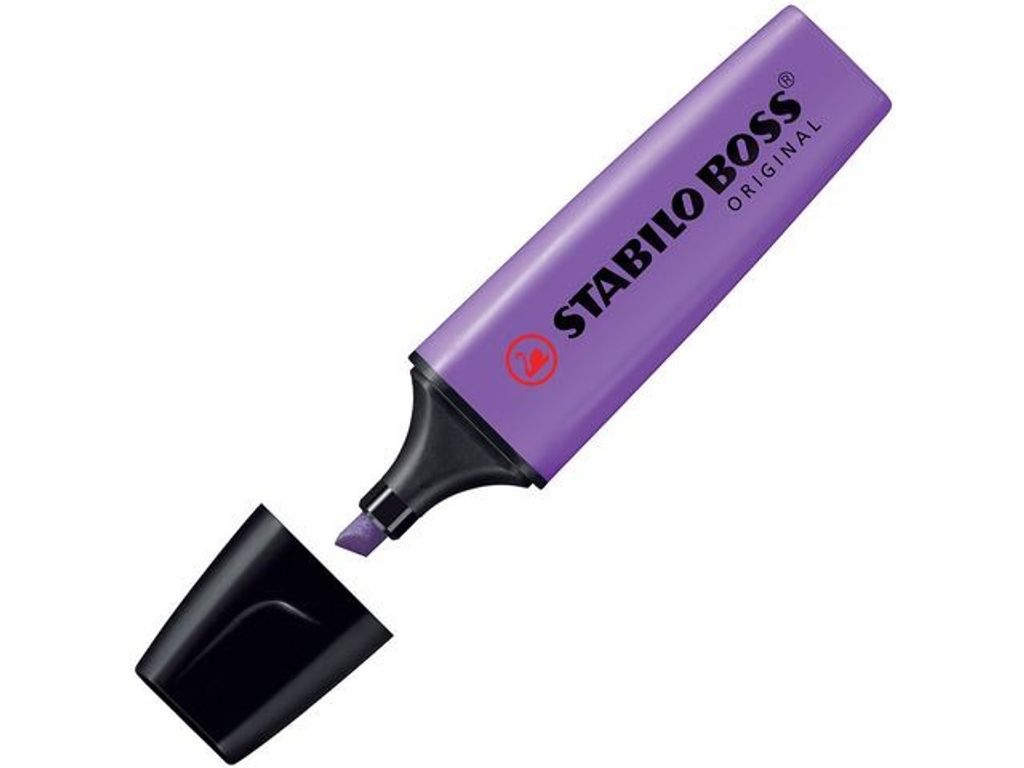 Markera text och viktig information med den klassiska överstrykningspennan STABILO® BOSS® ORIGINAL med Anti-Dry-Out-teknik. Överstrykningspennan från Stabilo Boss i sitt absoluta originalutförande med sin klassiska platta pennkropp som gör att den inte rullar iväg. Överstrykningspennorna har vattenbaserat bläck med Anti-Dry-Out-teknik som gör att de kan ligga utan huv i upp till 4 timmar utan att torka. Är lämplig att använda på vanligt papper, fotokopior och faxpapper. - Spetsbredd: 2-5mm - Skrivfärg: Lila - Färg pennkropp: Lila (svart huv)