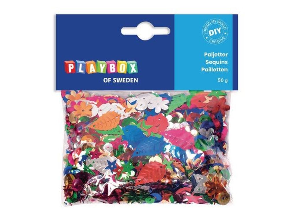 Paljetter med många olika motiv och i ett stort urval av färger. Använd paljetterna för pyssel eller dekoration - klistra eller sy på vykort, paket, teckningar, tyg eller dekorera bord vid festligheter. - Mått: Ø 6-24 mm - Färg: Guld, silver, röd, ceris, blå, grön, orange och rosa - Material: PET