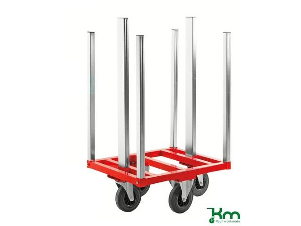 Beskrivning av Pallkragsvagn Praktisk pallkragsvagn. Elförzinkad. - Belastning 300kg - Storlek: 800 x 600 x 1215mm - Färg: Elförzinkad/röd - Vikt: 44kg - Bromsade hjul: Nej - Hjul: 2 fasta, 2 länk