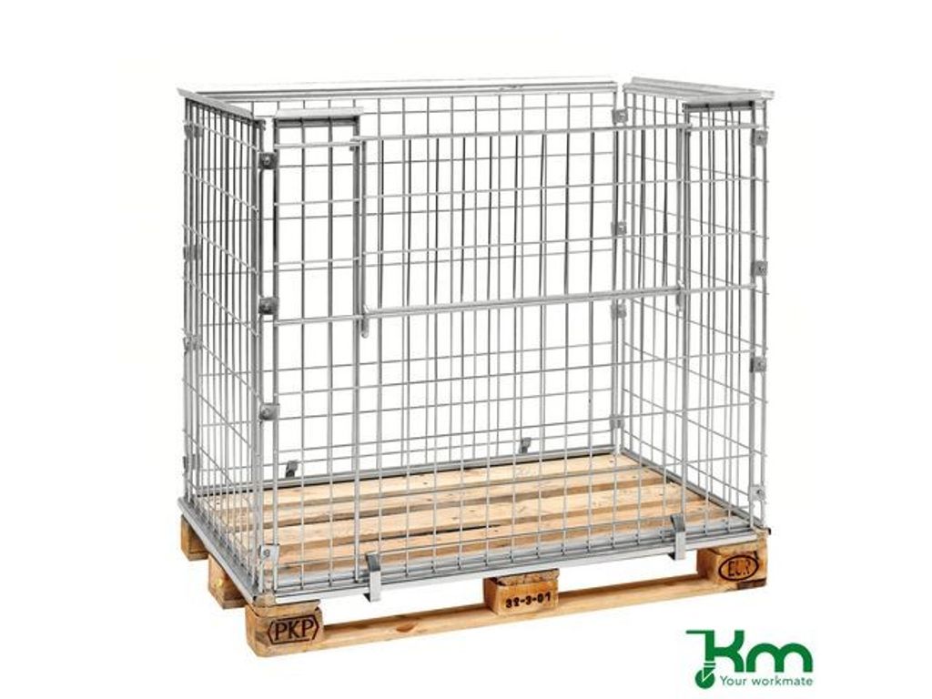 Pallram anpassad för EUR-pall. Anpassad för EUR-pallar med måtten 1200 x 800mm. Går enkelt att fälla ihop då den inte används och är stapelbar med belastning upp till 800kg. Öppning på långsidan. - Storlek: 1220 x 820 x 1020mm (LxBxH) - Invändigt mått: 1150 x 740 x 1000mm - Nätets maska: 65 x 120mm - Färg: Elförzinkad - Vikt: 32kg