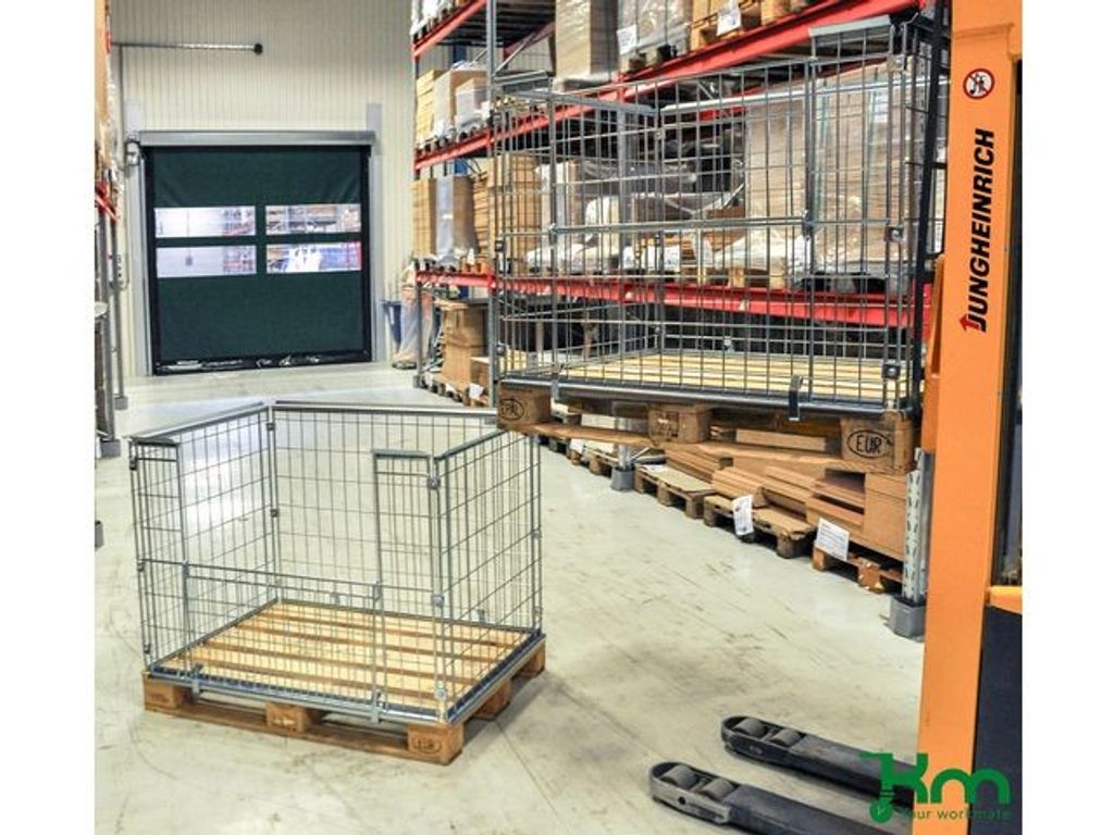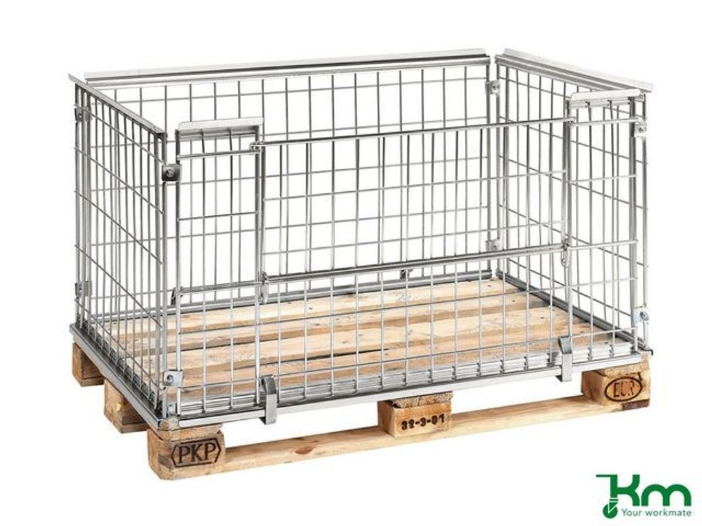Pallram anpassad för EUR-pallar. Anpassad för EUR-pallar med måtten 1200 x 800mm. Går enkelt att fälla ihop då den inte används och är stapelbar med belastning upp till 800kg. Öppning på långsidan. - Storlek: 1220 x 820 x 640mm (LxBxH) - Invändigt mått: 1150 x 740 x 620mm - Nätets maska: 65 x 120mm - Färg: Elförzinkad - Vikt: 24kg