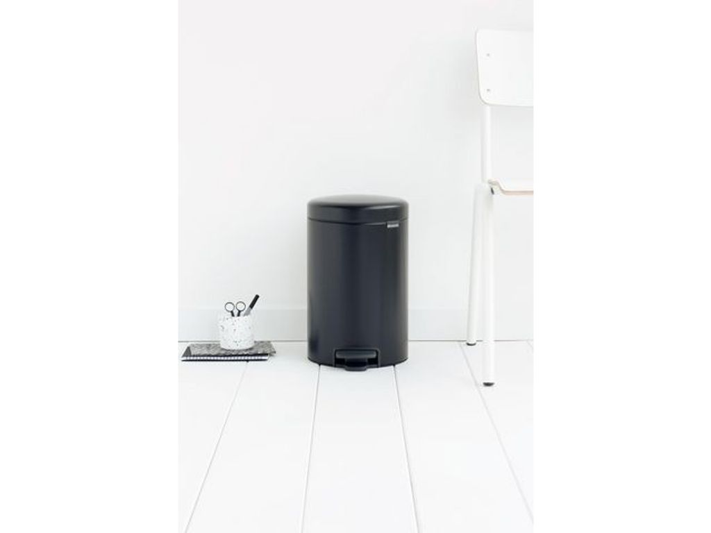 Håll skräpet borta med stil med hjälp av pedalhinken New Icon från Brabantia som är tillverkad av 40% återvunnen metall. Avfallstunnan är tillverkad i högkvalitativt slitstarkt kvalitetsmaterial och är försedd med en 'non-slip-base' som gör att den står stadigt på golvet, utan att skada golvet. Pedalhinken är även designad med en unik stängningsfunktion som gör att locket går igen långsamt och ljudlöst. Denna soptunna kan placeras i både kök och badrum. Genom att köpa denna pedalhink bidrar du till Brabantias arbete för en bättre miljö. Tillsammans med organisationen Plastic Whale och 'The Ocean clean up' fiskar de upp plast ur haven runt om i världen. - Kapacitet: 12 liter - Diameter: 25.1 cm - Höjd: 41.1 cm - Bredd: 25.1 cm - Djup: 33.8 cm - Färg: Matt svart