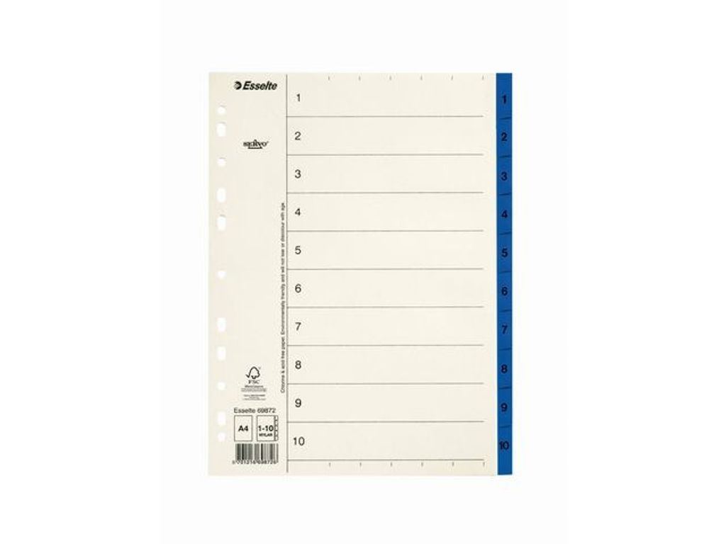 Esselte® Servo förtryckta avdelare ger en enkel och effektiv lösning för att organisera dina dokument i pärmar och mappar. Dessa Esselte®-avdelare är perfekta att använda på kontor och i skolor. De passar utmärkt för organisering av dokument och pärmar. Med omslagsbladet kan du enkelt märka och identifiera innehållet i mappen, medan indexavdelarna har flikar för enkel avdelning och referens. Avdelarna levereras med perforeringar på sidorna och är kompatibla med 2- och 3-ringpärmar. - Förtryckta avdelare, märkta 1–10 - Plastförstärkta flikar - 11 hål - Mått: A 4 - FSC-certifierat - Färg: Vit - Tillverkad av klor- och syrafritt papper