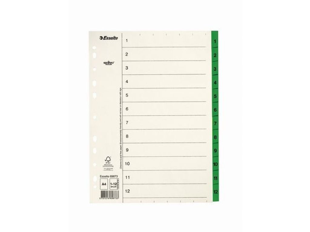 Esselte® Servo-avdelare ger enkel märkning och sortering med 1 förtryckt blad med 11 perforerade hål för universell användning. Esselte Servo-avdelarna är ett viktigt verktyg för organisering och kategorisering av kontors-, skol- och viktiga hemdokument. Varje Esselte Servo-avdelarblad levereras perforerat med 11 hål, vilket gör dem enkla att använda med en mängd mappar och pärmar med dokument. Du kan både skriva och trycka på FSC-certifierade Mylar Esselte Servo-avdelare och de kan skrivas ut med ett vanligt A4-format. Varje Esselte Servo-avdelarblad i kartong levereras förtryckt med 12 tydligt märkta utrymmen. - Avdelare för dokument och pärmar - Plastförstärkta flikar - Tillverkad av klor- och syrafritt Mylar-papper, kartong - FSC-certifierat - 12 avdelningar, märkta 1–12 - 11 perforerade hål på varje pappersark med fliketiketter för universell användning - Skrivbar i A4-format (210 x 297 mm) - Färg: Grön