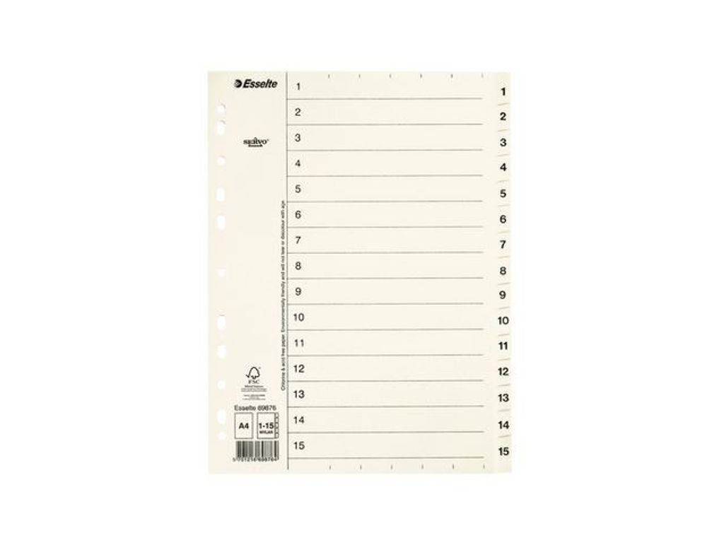 Organisera dina mappar och pappersarbeten med indexavdelarna från Esselte® med förtryckta etiketter för enkel identifiering. Indexavdelarna från Esselte® är perfekta för dokument på kontoret, i klassrummet eller hemma. Det är en effektiv lösning för dina märknings- och organiseringsbehov. Indexavdelarna har en förnumrerad design som gör det enkelt att sortera dokument för snabb identifiering och åtkomst. Avdelarna levereras hålslagna och är lämpliga för de flesta ringpärmar och mappar. - Indexavdelare för mappar och pärmar - Förtryckta flikar - Plastförstärkta flikar - Flikar: 1–15 - Mått: A4 - Färg: Vit - Tillverkad av klor- och syrafritt papper