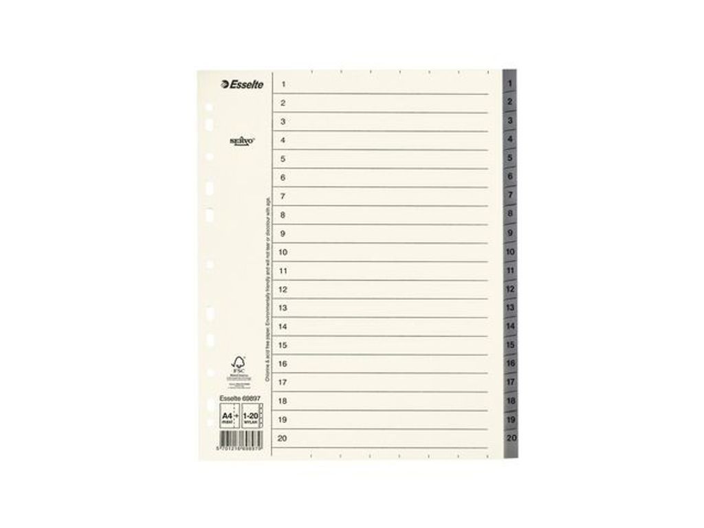 Esselte® Servo förtryckta avdelare ger en enkel och effektiv lösning för att organisera dina dokument i pärmar och mappar. Dessa Esselte®-avdelare är perfekta att använda på kontor och i skolor. De passar utmärkt för organisering av dokument och pärmar. Med omslagsbladet kan du enkelt märka och identifiera innehållet i mappen, medan indexavdelarna har flikar för enkel avdelning och referens. Avdelarna levereras med perforeringar på sidorna och är kompatibla med 2- och 3-ringpärmar. Tillverkas av 110g gultonat papper som är klor och syrafritt. - Förtryckta förstärkta plastflikar, märkt 1–20 - Mått: A4+ (245x3x297)