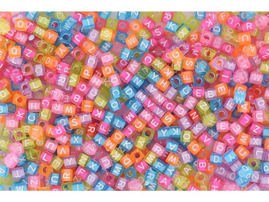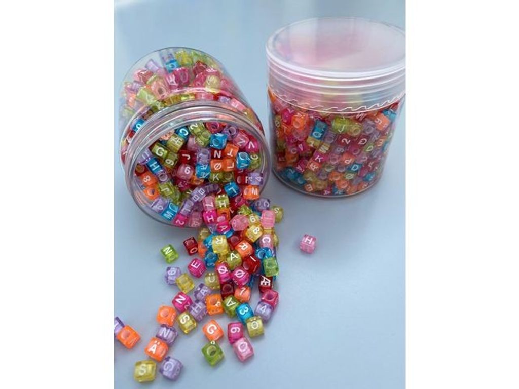 Använd dessa pärlor för ett pedagogiskt och kreativt vis att öva på bokstäver och siffror. Pärlor med både bokstäver och siffror, 700 per förpackning. Tillverkade i akrylplast. Kubformade i transparenta, ljusa färger. - Kubpärlor 6x6 mm med bokstäver och siffror. - Sorterade transparenta färger. - Håldiameter 3 mm. - Tillverkad av: Akryl Plast - Antal: 700/fp.