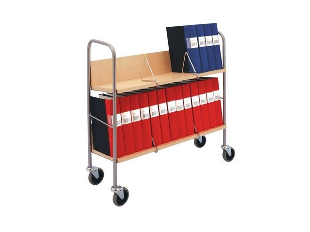 Den här pärmkärran är lämplig för kontoret, skolan eller biblioteket och den levereras med hjul för enkel förflyttning av arkivpärmar och tidskrifter. Den här pärmkärran levereras med två hyllor som rymmer upp till 26 arkivpärmar. Kärran är tillverkad av björklaminat och metall och är stabil och hållbar. Den levereras dessutom med fyra bokavdelare som smidigt kan justeras för att kategorisera böcker, filer och mappar som ska placeras på den. Björklaminatet på översidan och den gråa stativet ger kärran ett diskret utseende, vilket gör den lämplig för kontor och bibliotek. - Med justerbara bokavdelare - Rymmer upp till 26 arkivpärmar - Levereras med fyra hjul - Grått stativ medföljer - Material: Björklaminat och metall - Antal hyllor: 2 - Maximal belastning per hylla: 90 kg - Mått: 910 x 860 x 340 mm